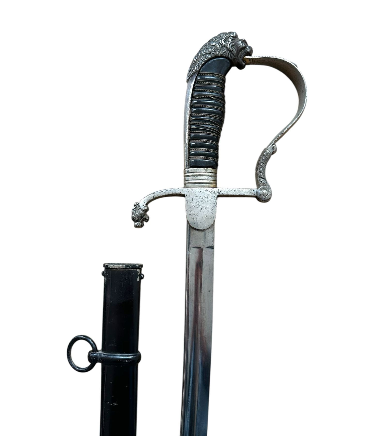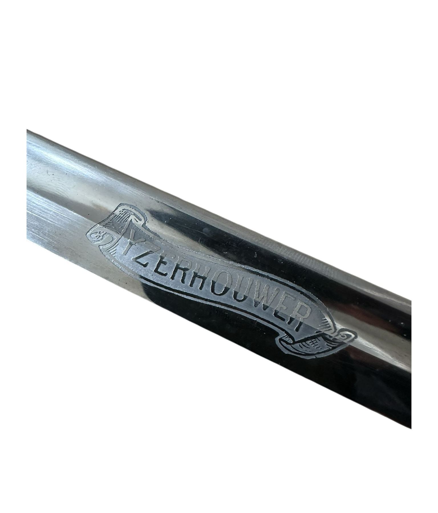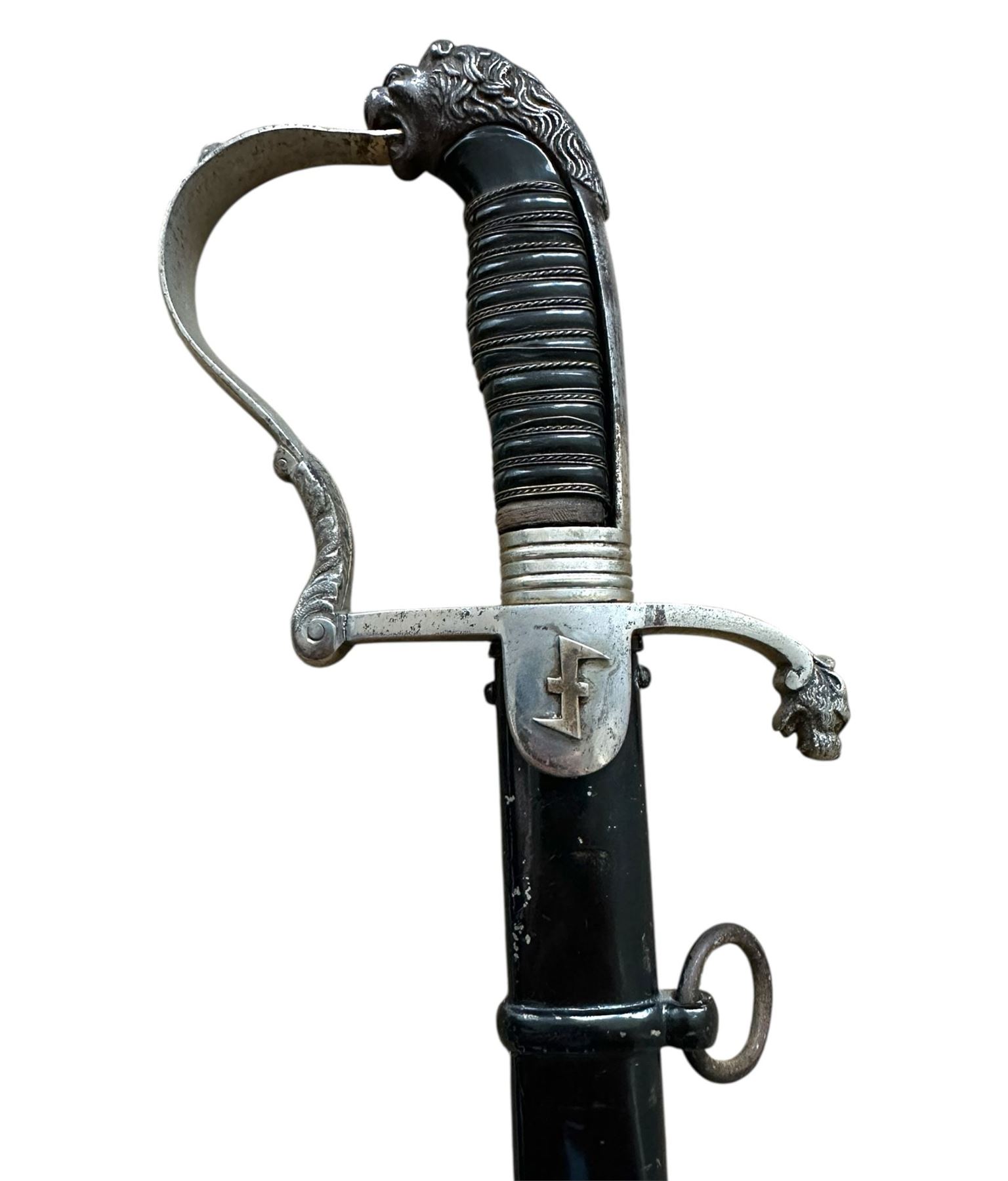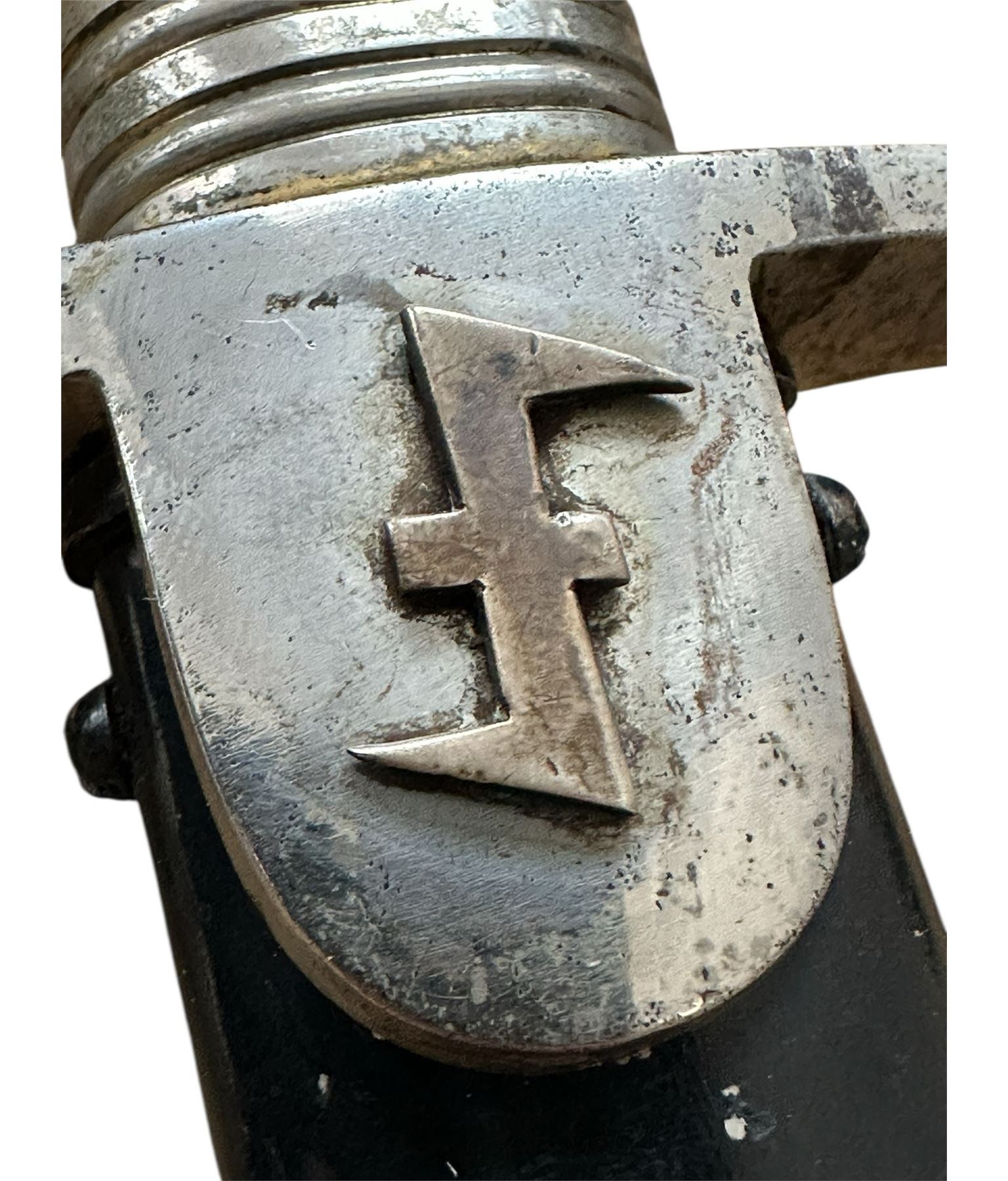 This very unique Dutch saber is in good condition and is a m1912 'Yzerhouwer' Police saber which was personalized by a Dutch collaborator NSB or Dutch SS during WorldWar II.The saber features a metal 'Wolfsangel' on the hilt, has a silver patina and the well known lion's head at the hilt.During World War Il, it was common for Dutch Police Officers to wear their saber at ceremonies or inspections.