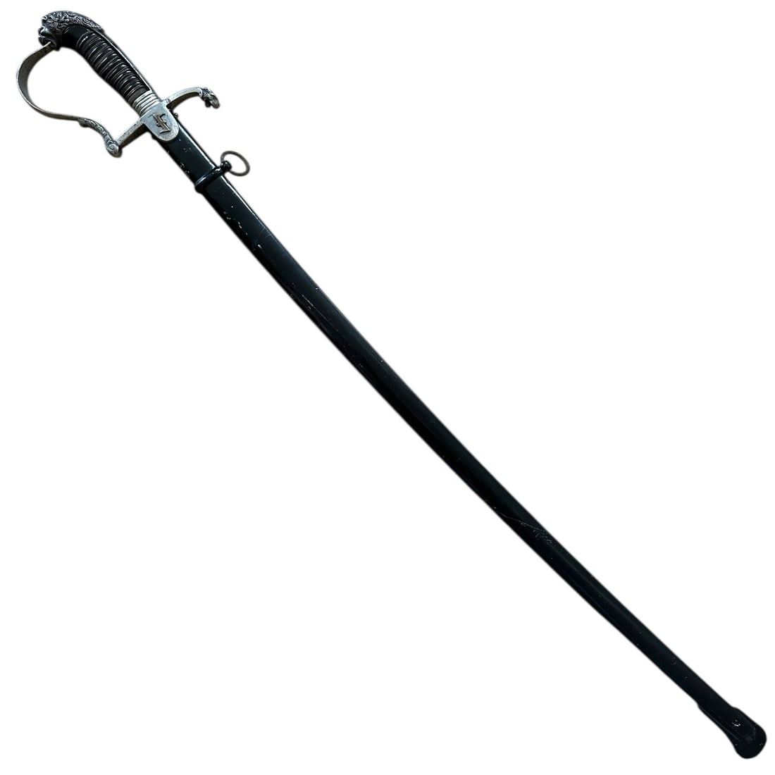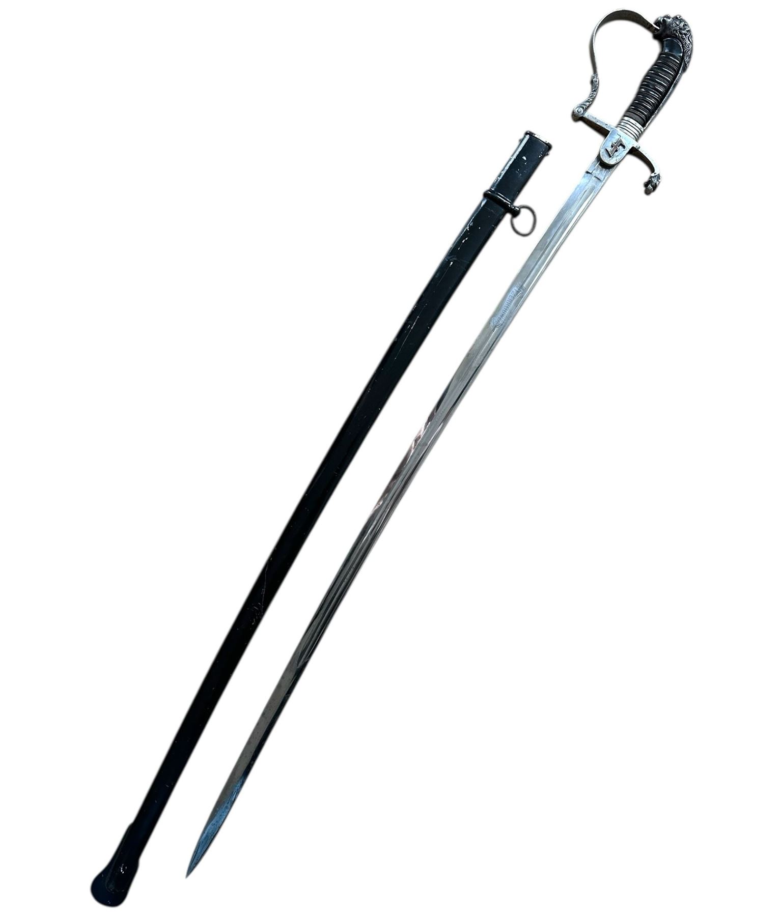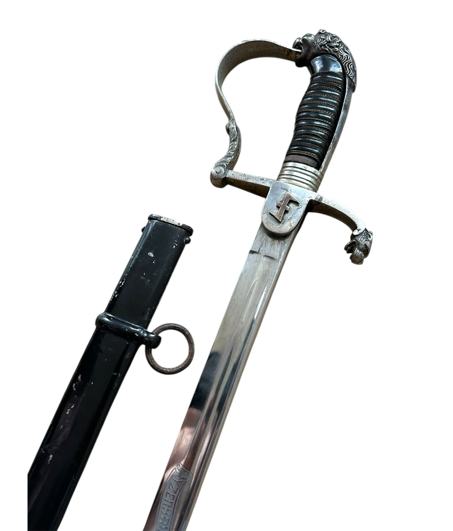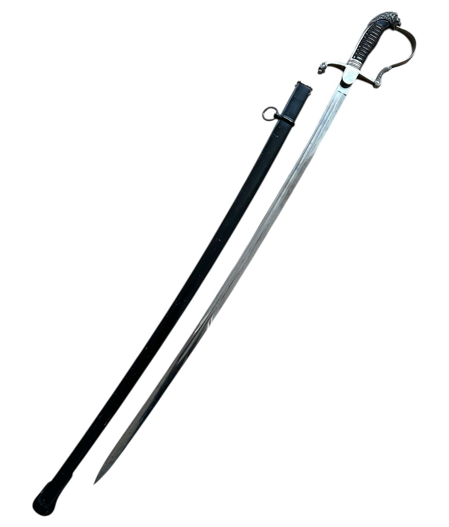 This very unique Dutch saber is in good condition and is a m1912 'Yzerhouwer' Police saber which was personalized by a Dutch collaborator NSB or Dutch SS during WorldWar II.The saber features a metal 'Wolfsangel' on the hilt, has a silver patina and the well known lion's head at the hilt.During World War Il, it was common for Dutch Police Officers to wear their saber at ceremonies or inspections.