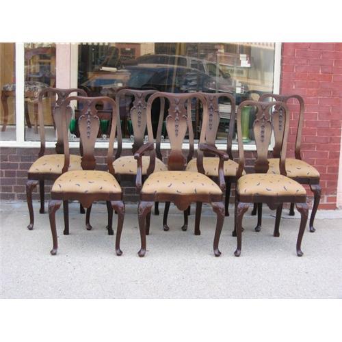 Late 19th Century Victorian cabriole leg oak Dining Chairs. Set of 7: 6 side chairs and 1 arm chair. Crafted in Holland or Denmark. Nicely hand carved details on the front corner legs which includes small flower buds diagonal incised carving and leaf design. The front of the backrest includes bellflowers similar to the leg and Victorian scroll work that is symetrical to balance the cascading effect of the carving. This design pattern was important in the Federal period of table leg design and especially in items that had many veneer inlays at that time.