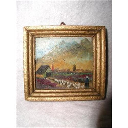 Petite Dutch oil painting on wood C.1920 from Holland depicts a woman dressed in long dress with white flowing pointed hat standing in her field of flowers with one of the out buildings in the distance as well as a windmill and other tall building. Beautiful coloring. Framed in an antique gold frame with hanger on the top. Excellent condition. Measures 4.5L X 4.25H X .75D.