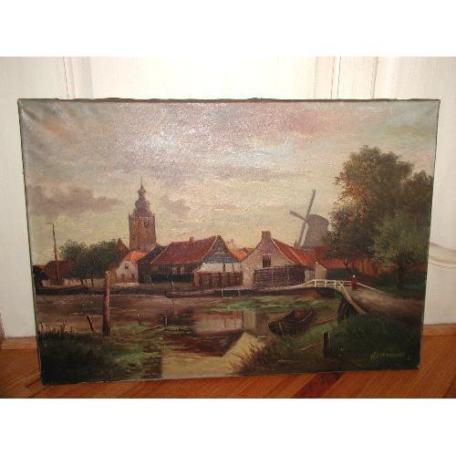 Gorgeous early to mid 19th century unframed oil on canvas Dutch oil painting by H. Meuerink,signed in lower right corner. Wonderful detail in the houses and church along the dock lined with small boats running beside the waters edge. A lone woman in dress of the day seen crossing the bridge with a large windmill in the distance under an overcast sky. The old wooden corner splints can be seen on the back of the canvas as well as the nails attaching the canvas on sides. Excellent condition. Measures 27.5L X 19.5H X 5/8D.