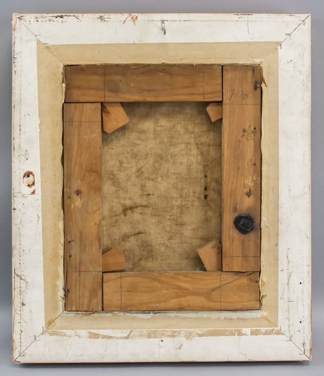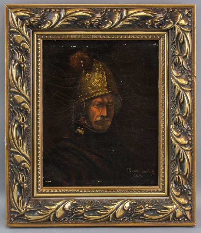 Oil on canvas, framed. Featuring a portrait. Signed Rembrandt. f. and inscribed f.1634 underneath signature. Chipped damage on frame in various locations with some damage alongside top and bottom of painting. One seal wax on right stretcher bar, verso. Inscribed H196 in pencil on upper right corner of stretcher bar, verso. Canvas size: 17 x 14.5 cm (12 x 10 inches). Frame size: 44 x 38 cm (30 x 25 inches)