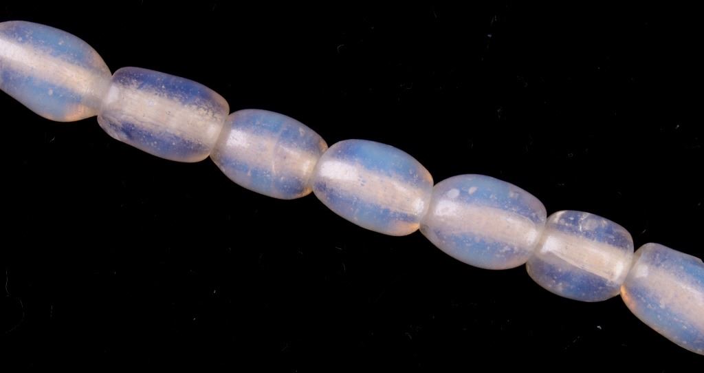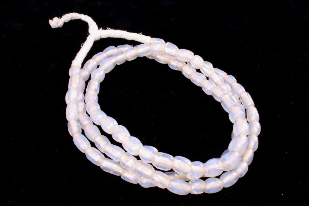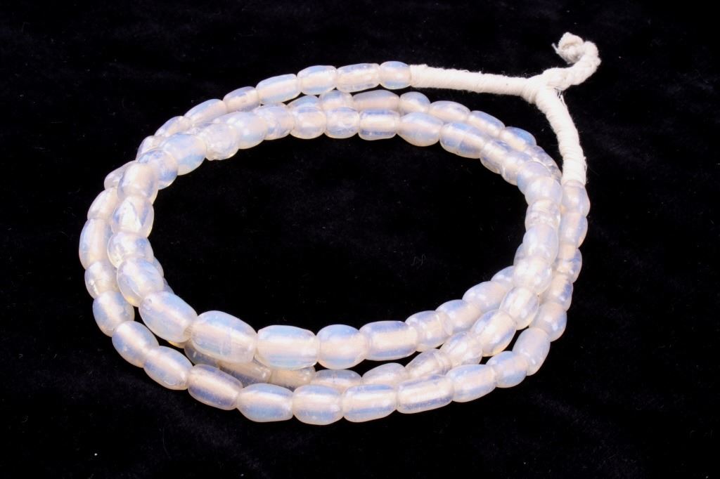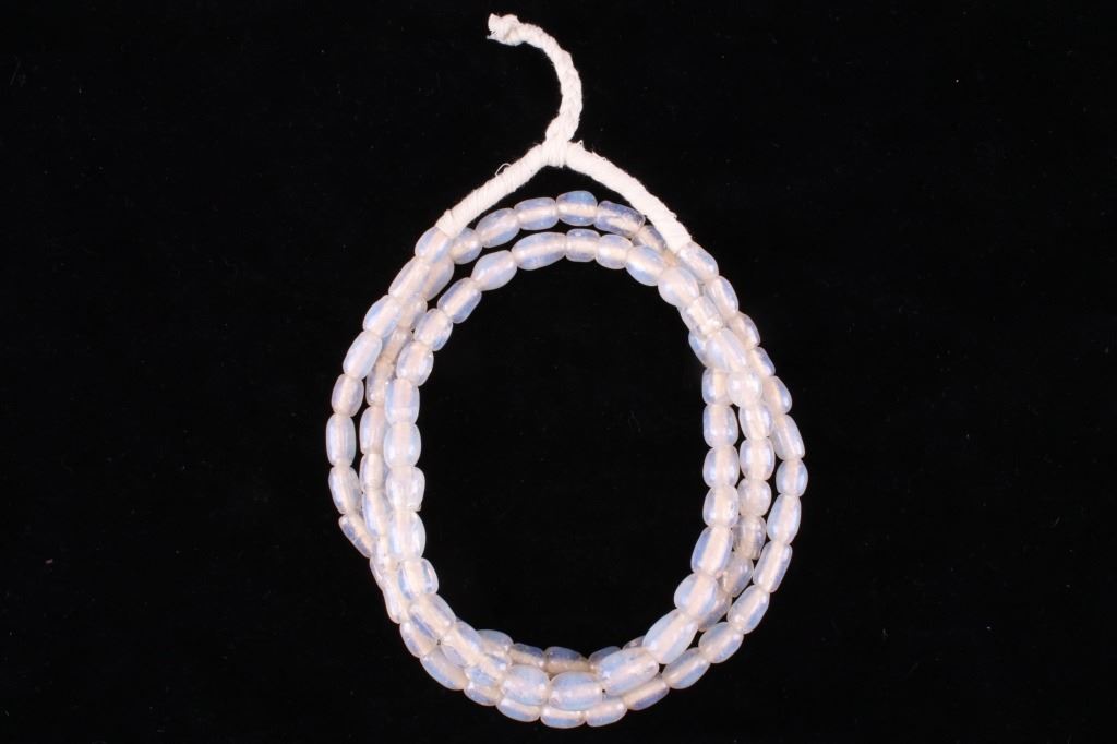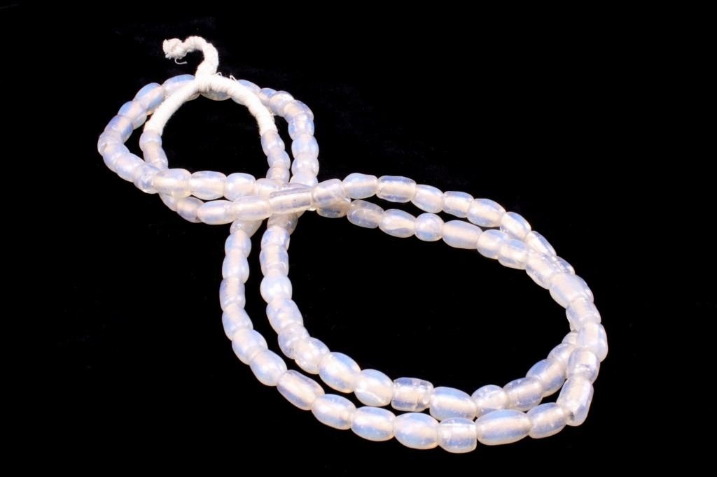In this lot is a large 50" strand of Oparte' Dutch trade beads from the 1700's. These are milky-opal glass beads. The beads vary slightly in size, but are approximately 1/2" long and 3/8" across. There are some slight chips and cracks on these very old beads. They are strung on a thick cotton thread and are in very good condition.
