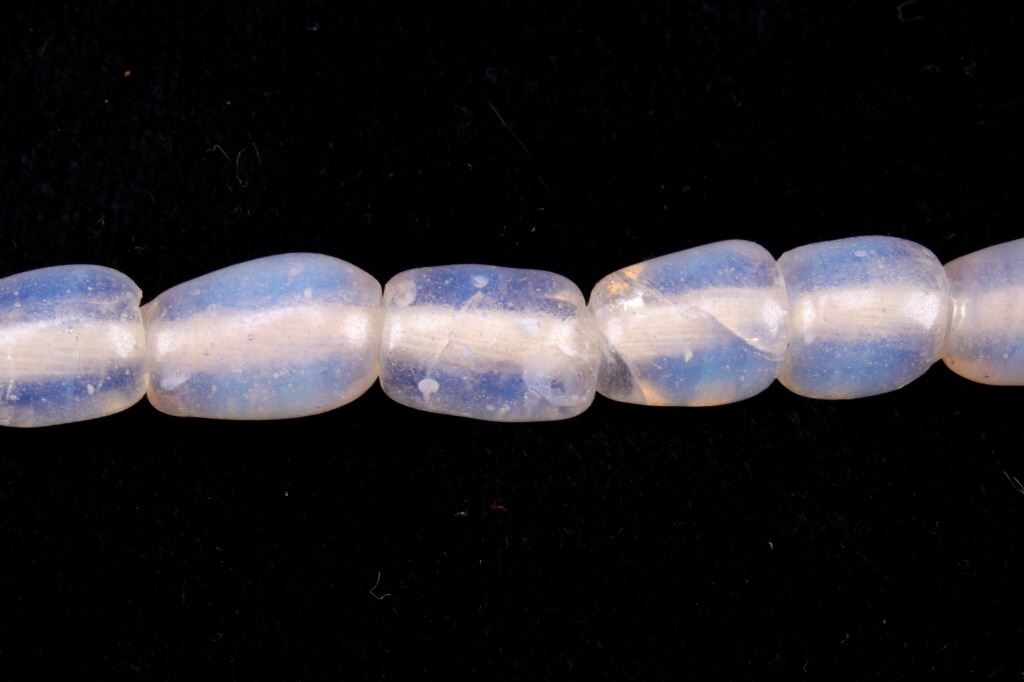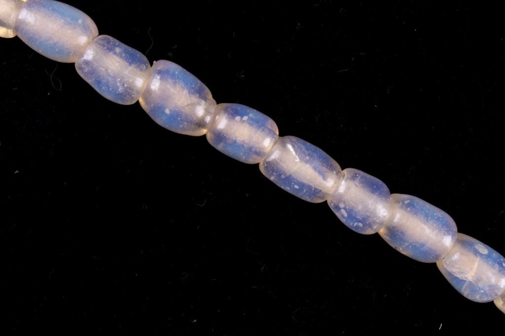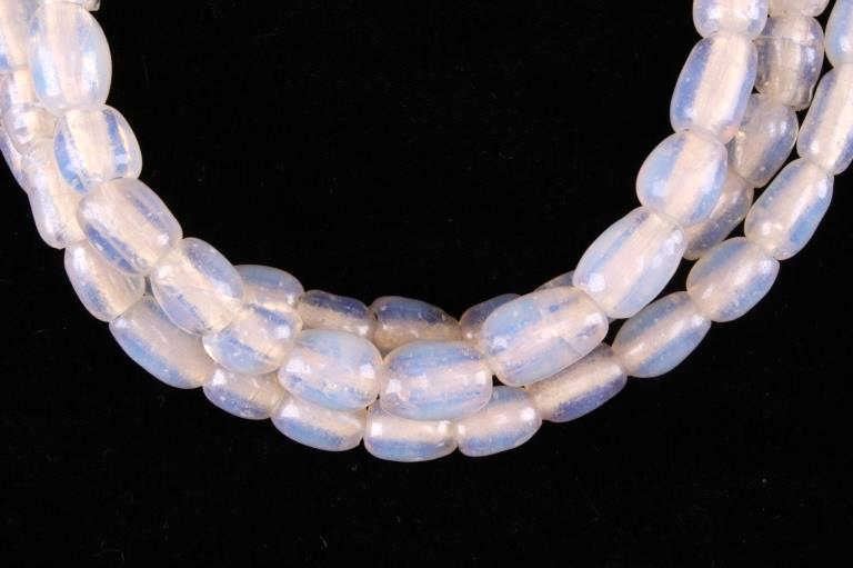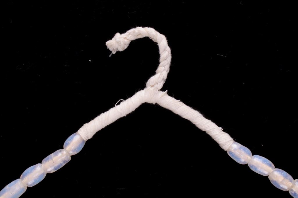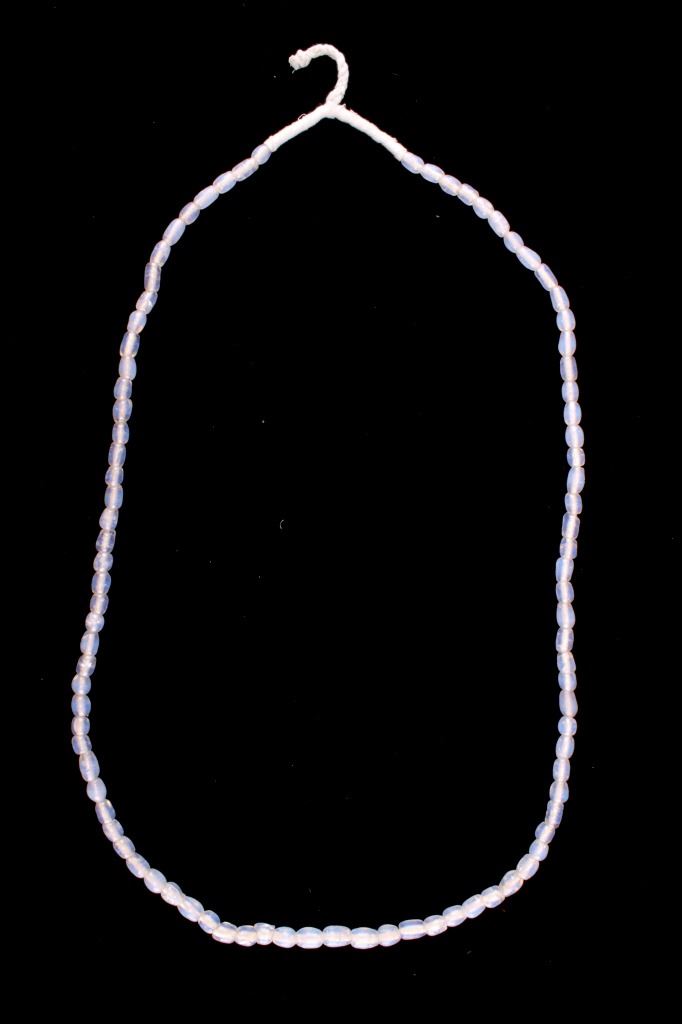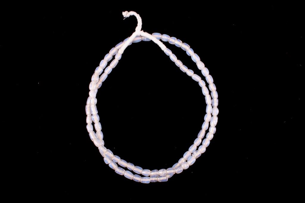In this lot is a large 50" strand of Oparte' Dutch trade beads from the 1700's. These are milky-opal glass beads. The beads vary slightly in size, but are approximately 1/2" long and 3/8" across. There are some slight chips and cracks on these very old beads. They are strung on a thick cotton thread and are in very good condition.