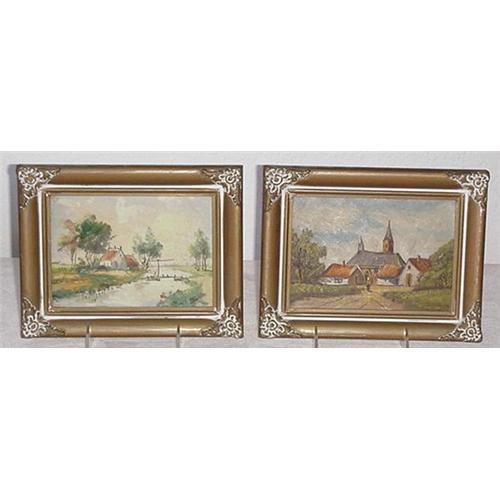 A pair of framed oil paintings on board, 7" X 9". The two paintings were painted in Holland probably in the 1950's and depict rural scenes, they are nicely framed and will add interest to your room. Condtion is good, they are marked on back as shown.