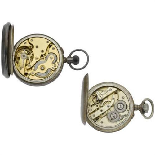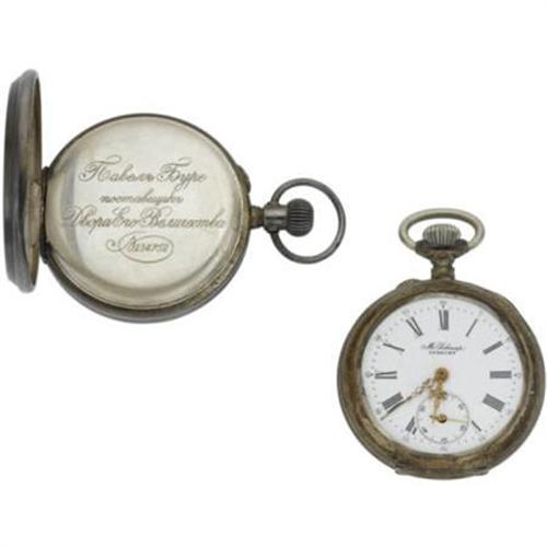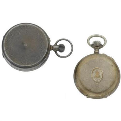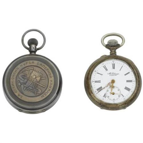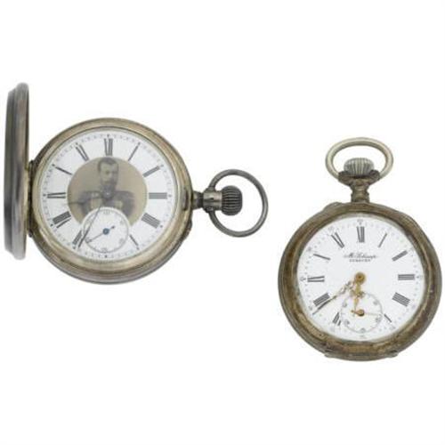 <B>Dutch & Russian Coin Silver Pocket Watch Lot</B></I><BR><BR>The lot includes one openface coin silver watch from the Netherlands:<BR>Case: 48 mm, hinged, smooth bezel and edge with engine turned caseback<BR>Dial: white enamel with black Roman numerals, goldtone "Louis XIV" hands and sunken auxiliary sweep seconds, marked M. Schaap Utrecht<BR>Movement: 38 mm, jeweled with nickel bridge, but otherwise unmarked<BR><BR>The second coin silver watch is of Russian origin:<BR>Case: 50 mm, hinged, engine turned with smooth edge and decorative case front panel depicting an intertwined pick, axe, shovel, trowel and shield framed by Russian script, ?a Ot??? Oko?? K?pca Ca?ep?o? Koma???<BR>Dial: white enamel with transfer print image of Czar Nicholas II, black Roman numerals, black elongated "Spade" hands auxiliary sweep seconds and mineral crystal<BR>Movement: no markings on movement; however dustcover is marked, and there is an additional inscription on the case front interior- both in Russian. Inscription dates to 1909. <B>Condition Report:</B> Dutch Watch:<BR>Missing crystal.<BR>Hour hand bent.<BR>Hairline cracks in dial.<BR>Watch is not in working order.<BR><BR>Russian Watch:<BR>Case it tarnished, but in otherwise very good condition.<BR>Dial is in very good condition.<BR>Watch is currently in working condition.<BR><BR><b>Shipping:</b> Miscellaneous Collectibles, Smal (<a target="_blank" href="http://www.heritageauctions.com/common/shipping.php">view shipping information</a>)