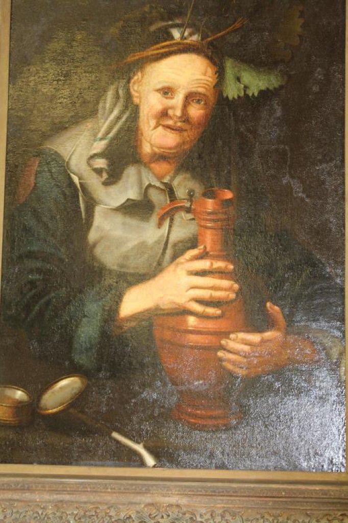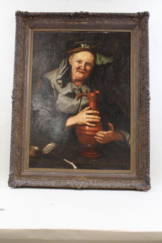 with water jug. Consignor purchased at auction for $11,000 long age. Great Period Frame. approx 33" x 24" image only. No major issues, just normal aging, with slight cracking. Est:5,000-10,000