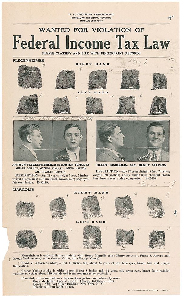Mobster, whose real name was Arthur Flegenheimer, (1902–1935) who made his fortune in bootlegging and the numbers racket. After two tax evasion trials against him by Thomas Dewey, Schultz saught permission to kill Dewey, which the Commission declined. After Schultz disobeyed the Commission and attempted to carry out the hit, they ordered his assassination. Original 1934 wanted poster, issued for Schultz and Henry Margolis by the US Treasury Department, one page, 8.5 x 14. Poster states Schultz, using his real name Arthur Flegenheimer, is wanted for “Violation of Federal Income Tax Law,” and features his ten fingerprints, mug shots, physical information, and his known aliases. Instructions at the bottom state, “If located, arrest and hold as a fugitive from justice.” In very good condition, with a central horizontal fold, light pencil marks throughout, paper loss to left edge, and a vertical mounting remnant to reverse of left edge.