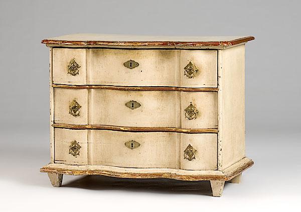 Dutch Rococo, ca 1760-1780, painted chest of drawers/commode in pine. The top conforming to the shaped case with four long drawers. Top, rails and base molded and highlighted in gilt paint, the whole on tapered quadrangular feet; 40" high x 51" wide x 23.75" deep.