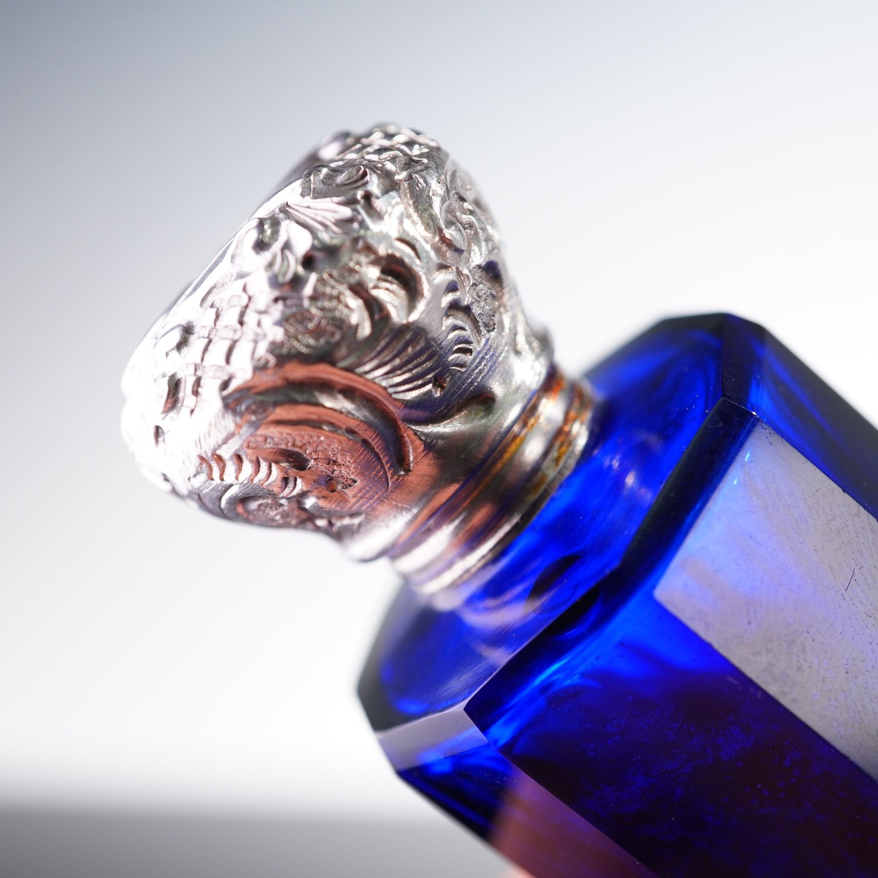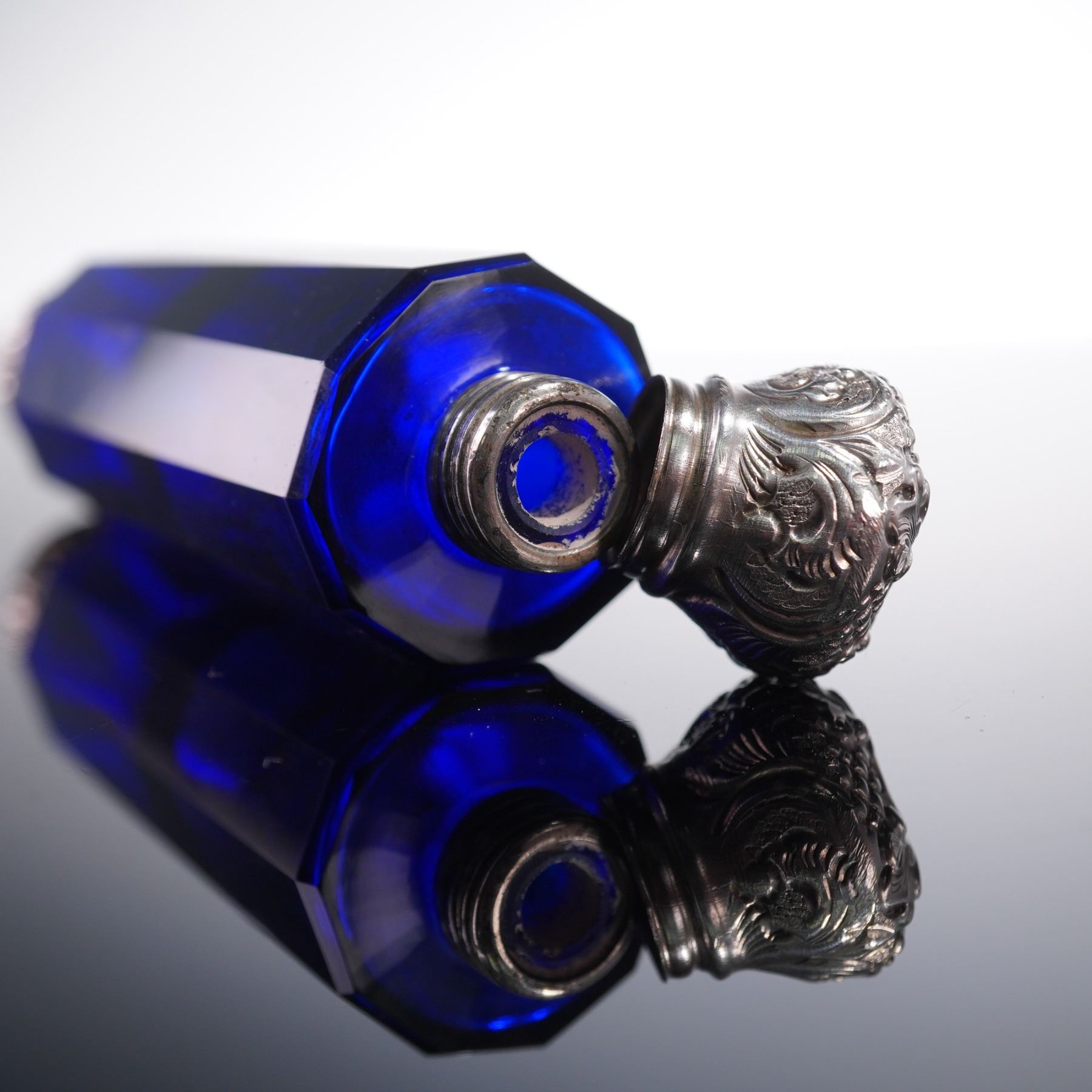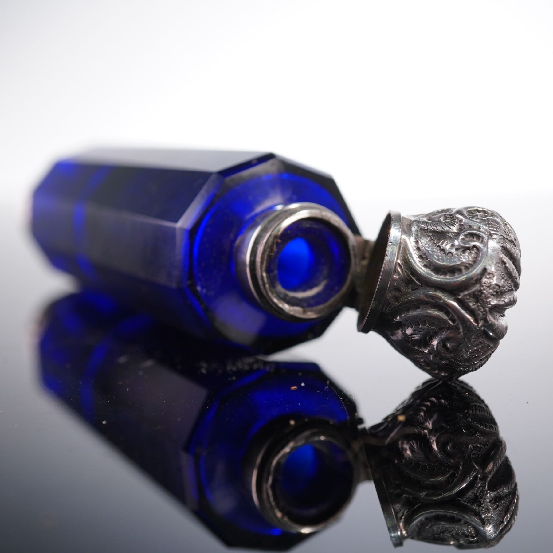Elegant Dutch double-ended scent bottle, featuring exquisite silverplate and metal mounts, crafted in the late 19th century. The deep cobalt blue glass is complemented by intricate detailing and fine workmanship, reflecting the artistry and decorative sensibilities of the period.