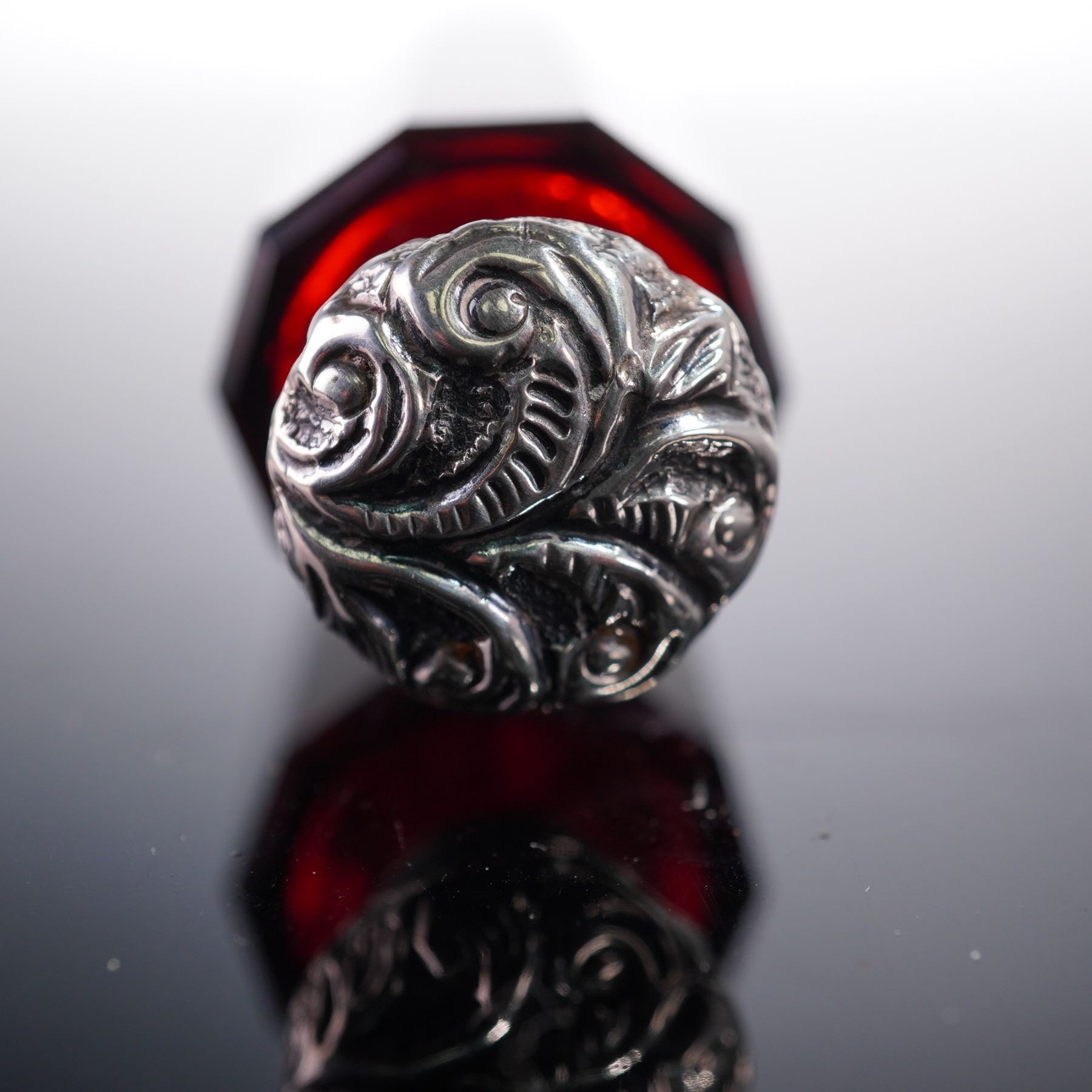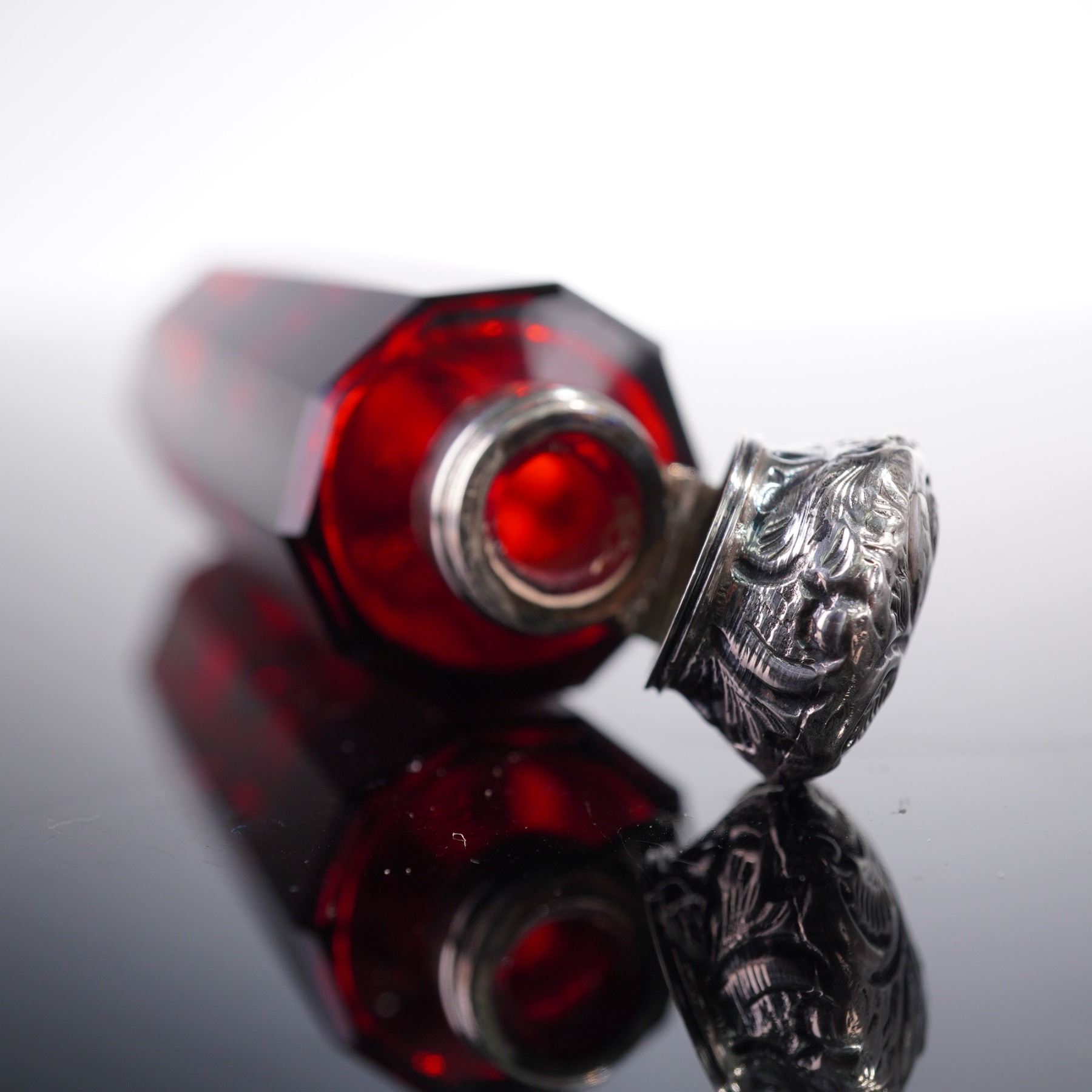 Elegant Dutch double-ended scent bottle, featuring exquisite silverplate and metal mounts, crafted in the late 19th century. The rich ruby red glass is complemented by intricate detailing and fine workmanship, reflecting the artistry and decorative sensibilities of the period.