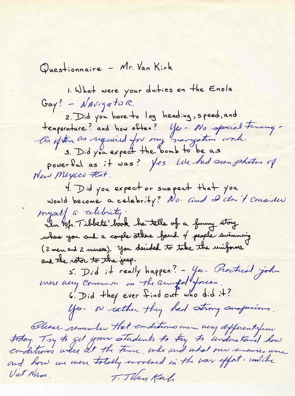 Handwritten questionnaire signed by Theodore ''Dutch'' Van Kirk, the Enola Gay Navigator. Van Kirk writes that he wasn't surprised at the bomb's power, ''…We had seen photos of New Mexico test…'' and ''Please remember that conditions were very different from today. Try to get your students to try to understand how conditions were at the time. Who and what our enemies were and how we were totally involved in the war effort - unlike Viet Nam / T.J. Van Kirk''. 8.5'' x 11'' single page document is in near fine condition.