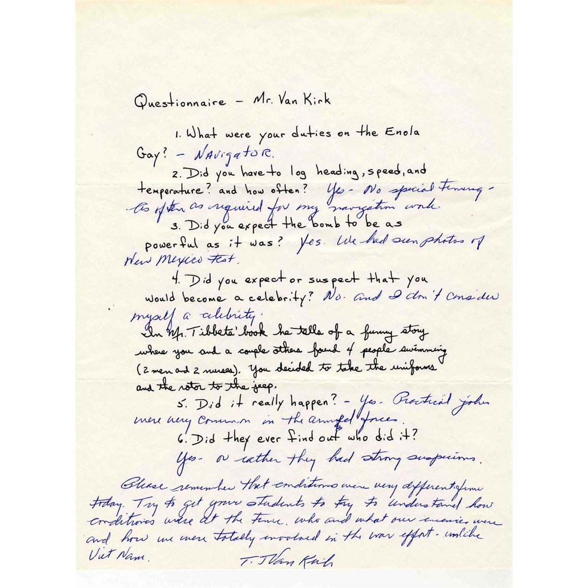 Handwritten questionnaire signed by Theodore ''Dutch'' Van Kirk, the Enola Gay Navigator. Van Kirk writes that he wasn't surprised at the bomb's power, ''…We had seen photos of New Mexico test…'' and ''Please remember that conditions were very different from today. Try to get your students to try to understand how conditions were at the time. Who and what our enemies were and how we were totally involved in the war effort - unlike Viet Nam / T.J. Van Kirk''. 8.5'' x 11'' single page document is in near fine condition.