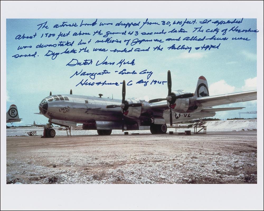 Color satin-finish 10'' x 8'' photo of the Enola Gay on the runway, signed in blue felt tip, ''The first atomic bomb was dropped from an altitude of 30,600 ft. It exploded about 1800 ft above the ground 43 seconds later. The city of Hiroshima was devastated, but millions of Japanese and Allied lives were saved. Days later the war ended and the killing stopped. Dutch Van Kirk, Navigator, Enola Gay, Hiroshima, 6 Aug. 1945.'' In fine condition.