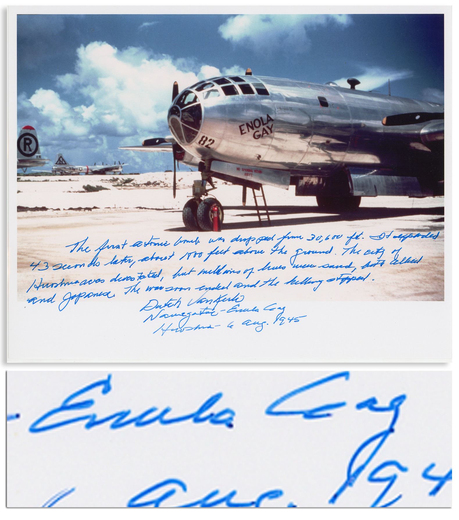 Theodore ''Dutch'' Van Kirk lengthy notation about the Hiroshima mission handwritten and signed upon a photograph of the Enola Gay. Composed in fine blue felt-tip, Van Kirk writes, ''The first atomic bomb was dropped from 30,600 ft. It exploded 43 seconds later, about 1800 feet above the ground. The city of Hiroshima was devastated, but millions of lives were saved, both Allied and Japanese. The war soon ended and the killing stopped. / Dutch Van Kirk / Navigator - Enola Gay / Hiroshima - 6 Aug. 1945''. Satin-finish photo measures 10'' x 8''. Near fine condition.