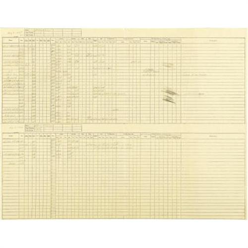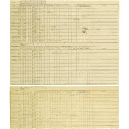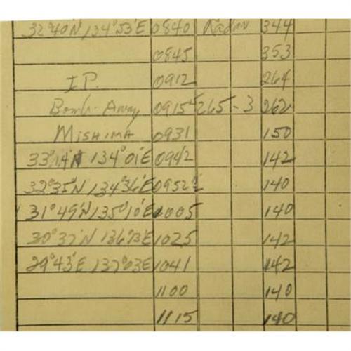 <B>Navigator Theodore "Dutch" Van Kirk's</B></I> <B><I>Enola Gay</B></I></B></I> <B>Log, in pencil, 2 large folios, 26" x 20.25" and 26" x 10". Tinian Island to Hiroshima, Japan, and back, August 6, 1945.</B></I> <BR><BR>Capt. Theodore "Dutch" Van Kirk was the navigator of the <I>Enola Gay,</B></I> the B-29 bomber which dropped the world's first atomic bomb used in war. The historic flight lifted off from Tinian Island at 2:45 A.M. on August 6, 1945. At 15 seconds past 8:15 a.m., "Little Boy," a 9,000-pound uranium-235 core-fissionable atomic bomb was released over Hiroshima, Japan. Forty-three seconds later, after the bomb detonated at 1,890 feet, the city was decimated; 71,000 were killed or assumed dead, 68,000 were injured and 60,000 buildings were destroyed. A second atomic bomb was dropped on Nagasaki, Japan, three days later. Japan surrendered a week later. The war in the Pacific was over. World War II had ended. <BR><BR>All times noted in the log are local Tinian time, one hour ahead of Hiroshima time. All speed and distance figures are in nautical miles (knots). "Our takeoff time was 2:45 A.M…The <I>Enola Gay</B></I> was stripped down - a big metal tube with a lot of instruments and people in it…anything we did not absolutely need, we discarded," recalled Van Kirk years later. "It was about 6,000 lbs. lighter. The purpose of the log, was to record flight data used by the navigator to keep the airplane on course and on time, and, also, to allow the navigator to determine aircraft location in a short time in the event of problems with the plane or bomb." Concerning the method of navigation, Van Kirk explained, "the line of small uninhabited volcanic islands between Tinian and Iwo Jima permitted good course control via radar. During darkness, until about 4:45 A.M., celestial sightings on the star Polaris gave latitude readings and therefore good speed lines on the course we were flying. During daylight, between Iwo Jima and Japan, good weather permitted accurate drift readings and from them accurate wind calculations. Also," added Van Kirk, "visibility was outstanding allowing visual sightings of the Japanese coast line about 75 miles away at our high altitude." <BR><BR>The log is exactly as Capt. Van Kirk prepared it during the flight 62 years ago, and includes pencil markings made to sharpen the lead point. There have been no additions, corrections, or alterations of any kind. The plane's position at various times during the flight is noted in the first column, mostly by latitude and longitude. Three times during the flight, Van Kirk notes "<I>Reset Compass.</B></I>" The first entry is "<I>N Tip Siapan 0255 1/2</B></I>" indicating that 10 1/2 minutes after takeoff, the <I>Enola Gay</B></I> was at the northern tip of Saipan (spelled incorrectly by Van Kirk), about 15 miles north of Tinian. It was at "<I>IWO</B></I>" at "<I>0555 Circleing left.</B></I>" Iwo Jima is located at 24º 47' N 141° 19' E. By "<I>0815</B></I>," the <I>Enola Gay</B></I> was flying over "<I>31º 15' N 136º 12' E</B></I>". At "<I>09:12</B></I>"Van Kirk notes "<I>Large T ships in harbor at Mishima</B></I>". Three minutes later, he records: "<I>Bomb Away 0915 15</B></I> ." That was Tinian time; it was one hour earlier in Hiroshima. Van Kirk adds additional comments at the right, under "<I>Remarks</B></I>,": "<I>Circle E of Target</B></I>." At "<I>0931</B></I>," the <I>Enola Gay</B></I> was flying over "<I>Mishima</B></I>," about 70 miles southeast of Hiroshima. Van Kirk kept his eyes on the aftermath of the explosion and significantly notes: "<I>10:52 - Cloud Gone</B></I>". It was not until an hour and 37 minutes and much distance later, that the mushroom cloud explosion would finally disappear from Van Kirk's line of vision. The <I>Enola Gay</B></I> would continue its return journey: "<I>IWO</B></I>" at "<I>1219</B></I>," and back to "<I>BASE</B></I>," at Tinian, at "<I>1458</B></I>," after 12 hours 13 minutes that changed the nature of warfare forever. <BR><BR>The log has been stored folded, and has a few additional creases and mis-folds. The pencil markings are clear and very legible. The paper has a couple of small tears at margins and a few tiny chips. All wear is in keeping with age and expected use. <BR><BR>The log is accompanied by two photographs of the crew. The first is a 10" x 8.5" color reprint labeled, "<I>Dutch VanKirk / getting out of plane / Return from Hiroshima</B></I>" in Van Kirk's holograph. The second is a 10" x 8" print of the debriefing after the mission. On the verso, Van Kirk has identified the scene and names everyone present: "<I>Debriefing after Hiroshima mission / Back to camera - Hazen Payett - Intelligence officer / On the left around table / Dutch Van Kirk - reading from log / Paul Tibbett / Adm Parnell / General Giles / General Tony Spaatz - at head of table / Captain Deak Parsons / J</B></I> ? <I> Stiborik / Bob Lewis / Tom Ferebee / Bob Caron</B></I>". On December 7, 1990, 17 years ago, Christie's offered for sale what it described as "the original manuscript navigator's log of the B-29 bomber the Enola Gay." It was written on three folded sheets of lined paper and was said to be in the hand of Capt. Theodore Van Kirk. The co-pilot, Capt. Robert A. Lewis, wrote on it "attested as true." Capt. Lewis died in 1983. His widow, Eileen Lewis, consigned it to Christie's and it was estimated to sell for $100,000 to $150,000. Capt. Van Kirk contacted Christie's, stating, "I am quite confident that the log which I have in my possession is the one I kept on the airplane." At the sale, Christie's auctioneer Stephen Lash announced that the log was in an unidentified hand and "Christie's cannot determine authoritatively that this log was maintained during the mission." The log did not sell. On March 27, 2002, Christie's sold for $350,000 what was described as Capt. Lewis's logbook. What it was, in fact, was his diary with his comments before and after the bombing, such as "There wil