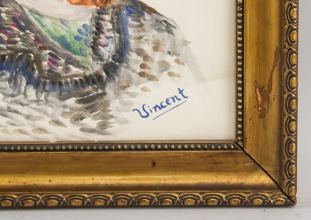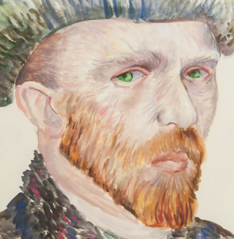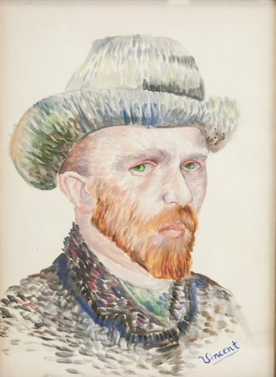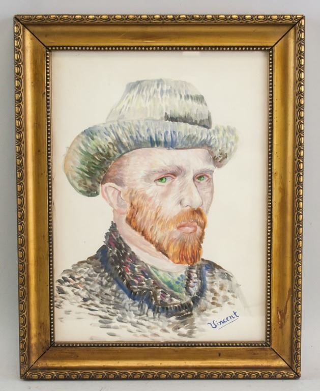 Watercolor on paper, framed. Featuring portrait of Vincent van Gogh. Signed "Vincent" to the bottom right corner. Partial stamp on verso. Paper size: 34 x 25 cm (13.25 x 9.75 inches). Frame size: 39 x 31 cm (15.5 x 12.25 inches).