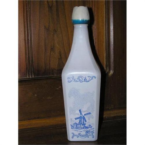Pretty blue and white bottle with Dutch Windmills on the sides. Has the look of delft. In good condition. The top is plastic and is shaped like a tulip. That is also in good condition.
