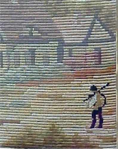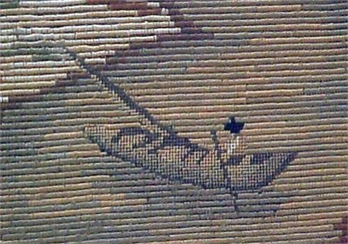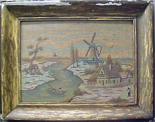 Dutch allegorical petit-point and needlework; image depicts landscape with figures in boats and windmill; image measures 12" x 16 1/4"; framed; 18th C. or early 19th C. (no visible defects)