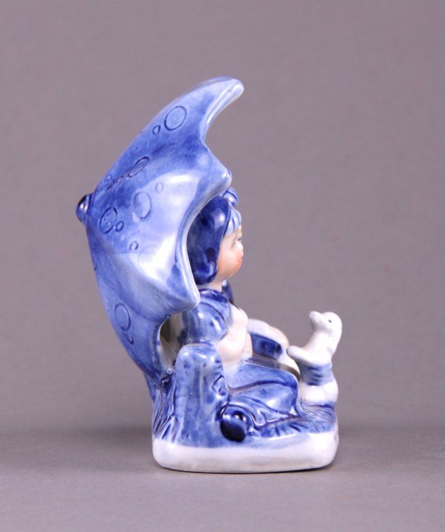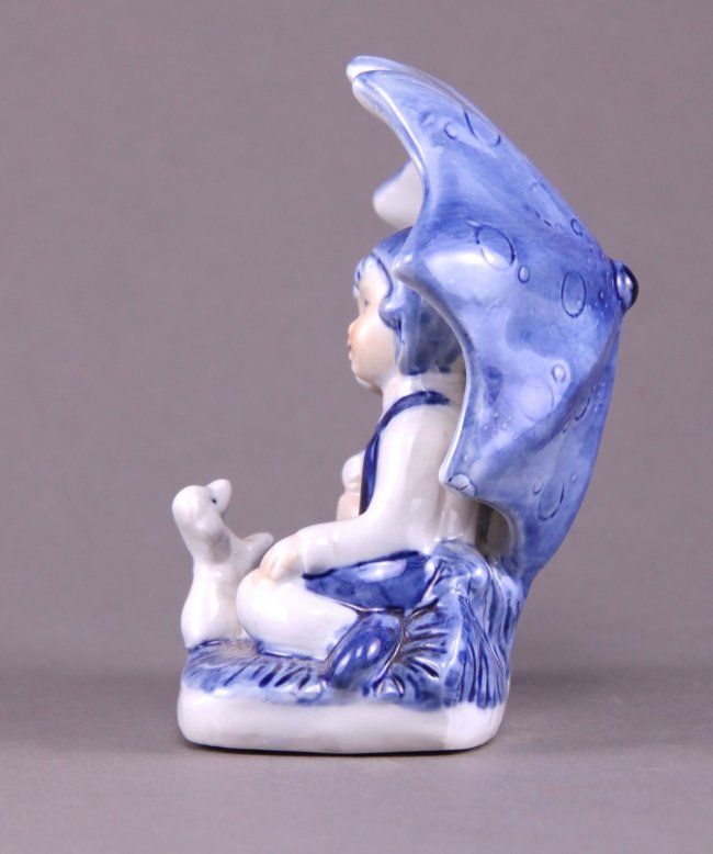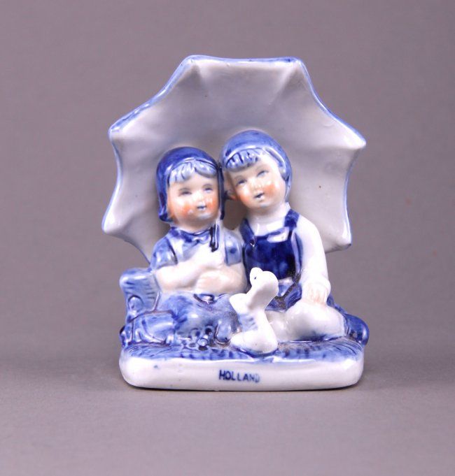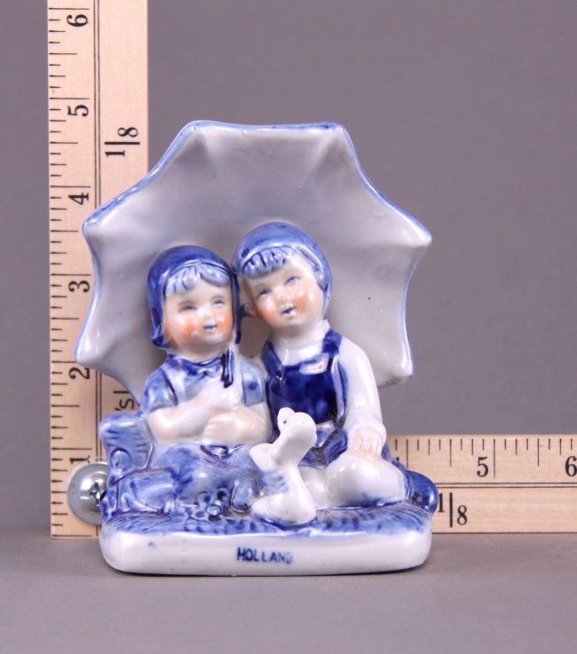Dutch ceramic figurine of children under a umbrella. "Hand Painted, Holland." (Size: See last photo for measurement.) Photos are part of the description representing the condition report. Pangaea Auctions urges Bidder's to view all attached photos.