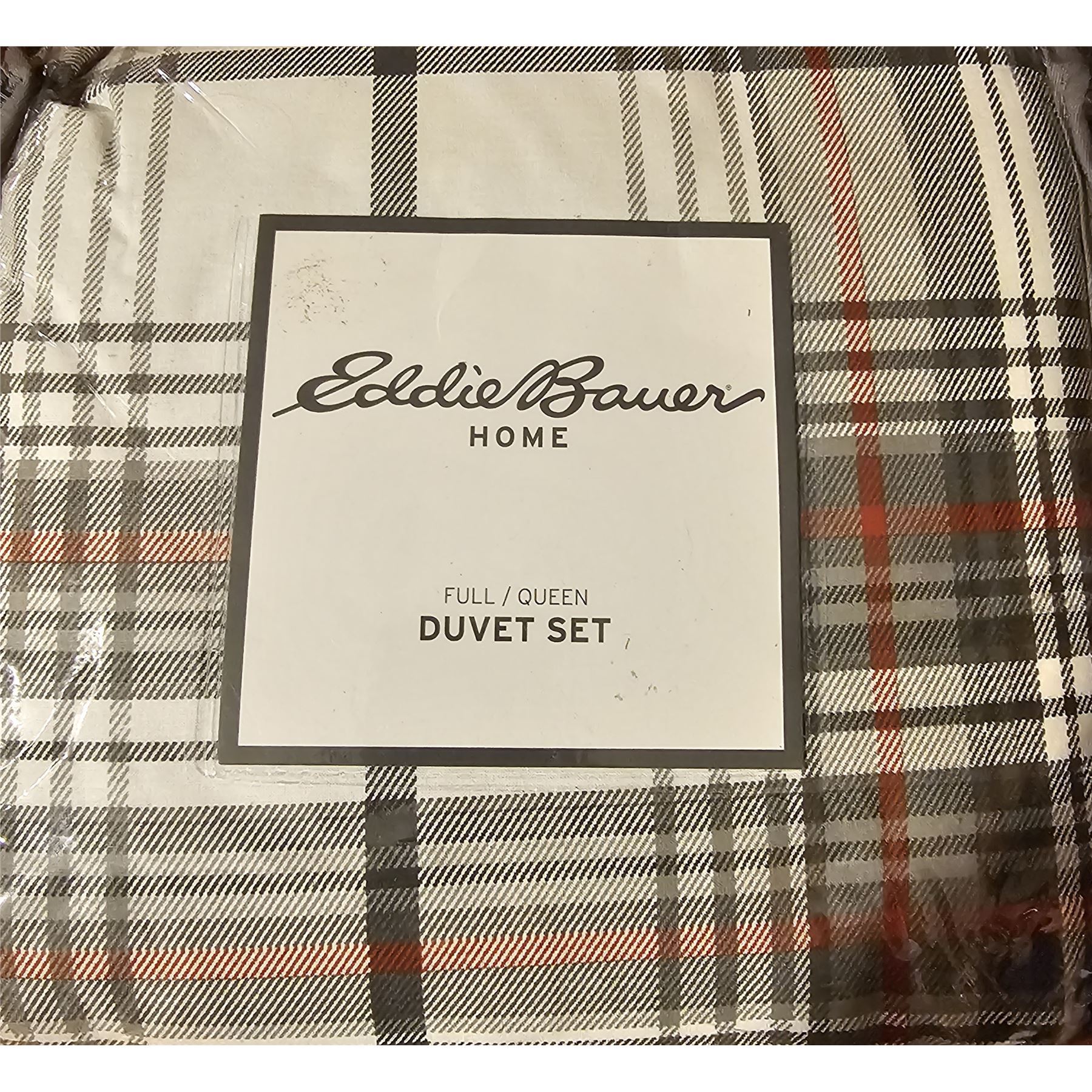 Plaid pattern with neutral tones, includes duvet cover and 2 pillow shams, new.