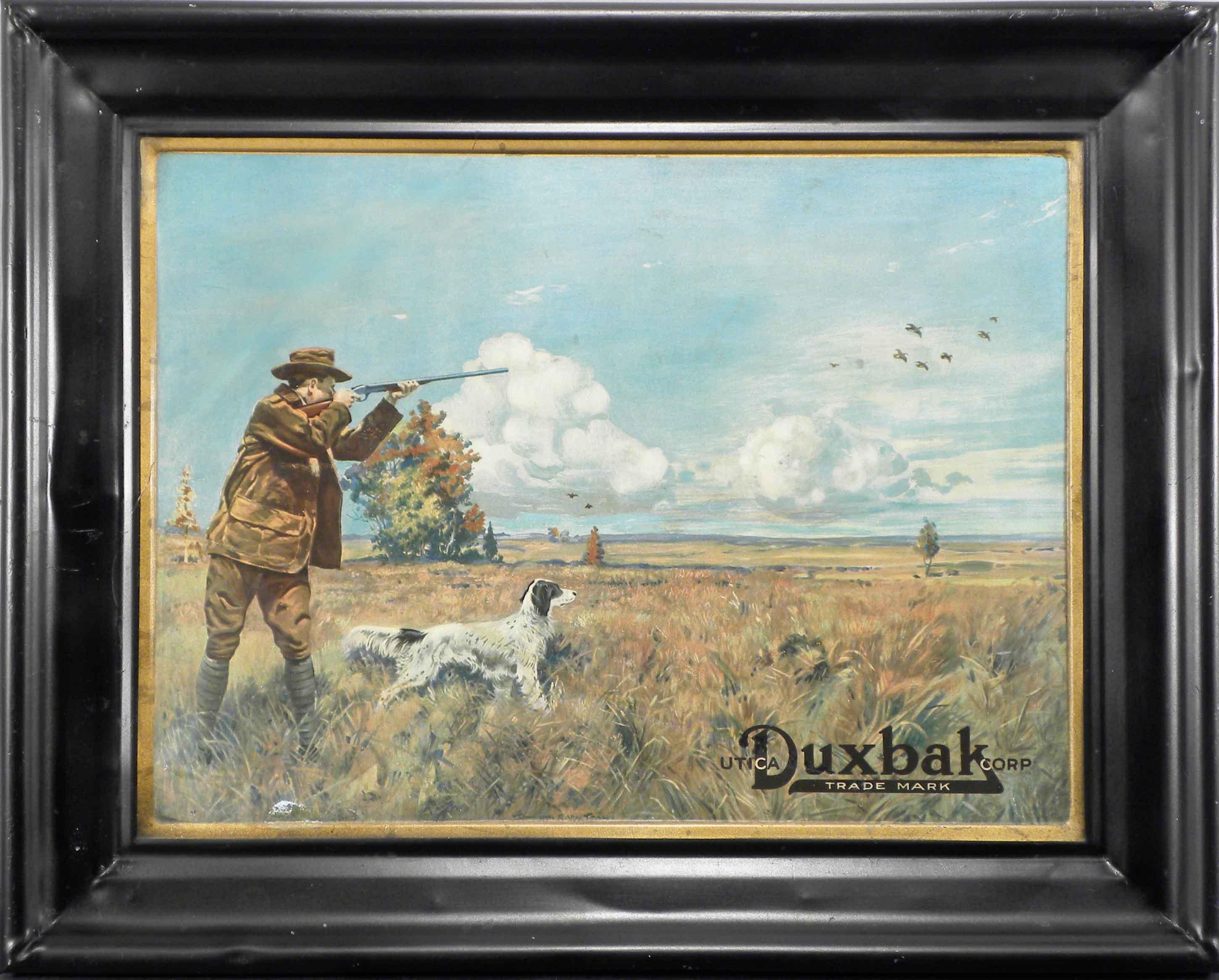 Duxbak Firearms Self Framed Tin Sign. Utica Corp. Some minor dents at 9:00, small restored spots in image and scratches otherwise good condition. 19 1/2 X 15 1/2 inches.