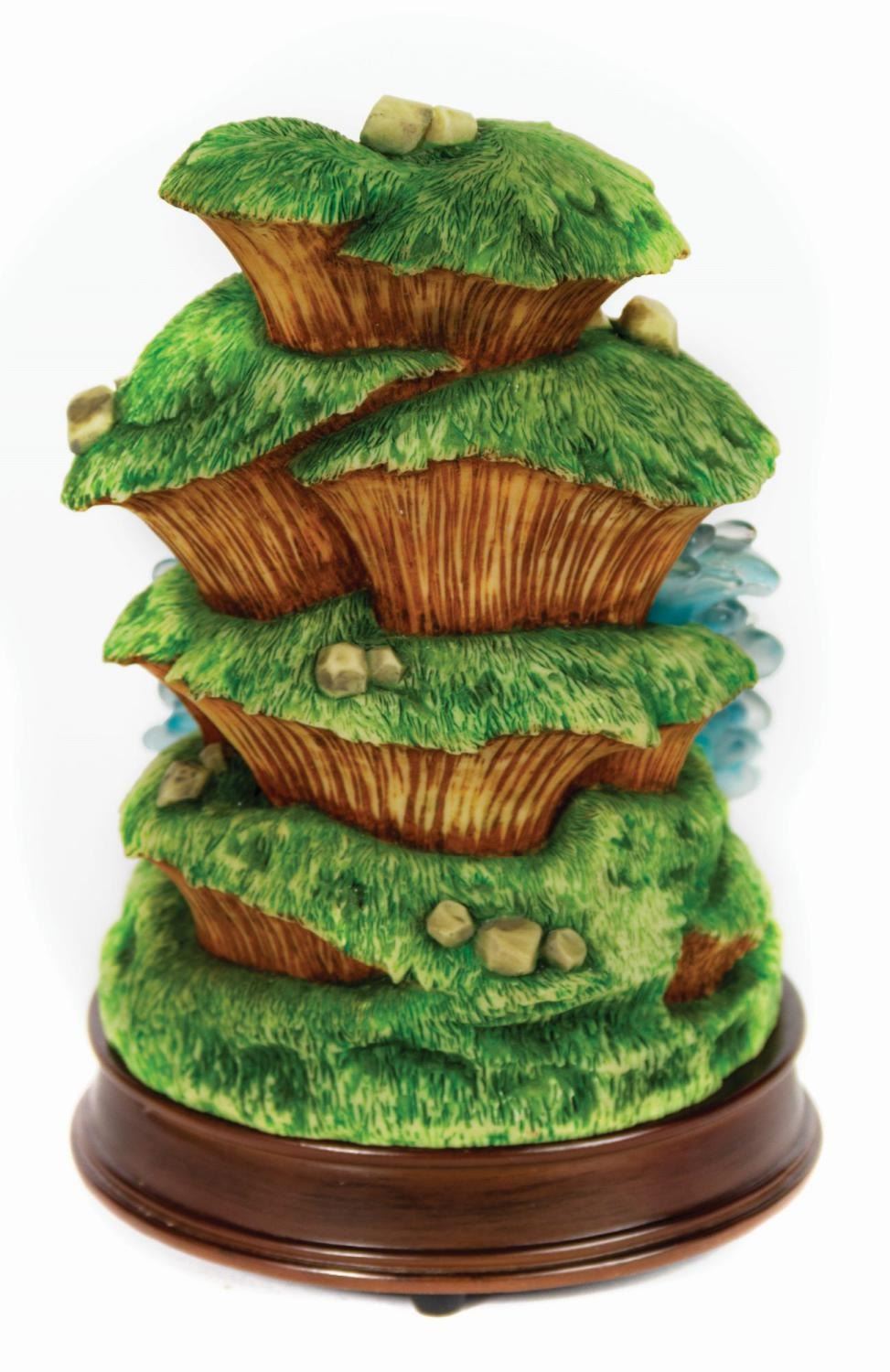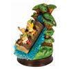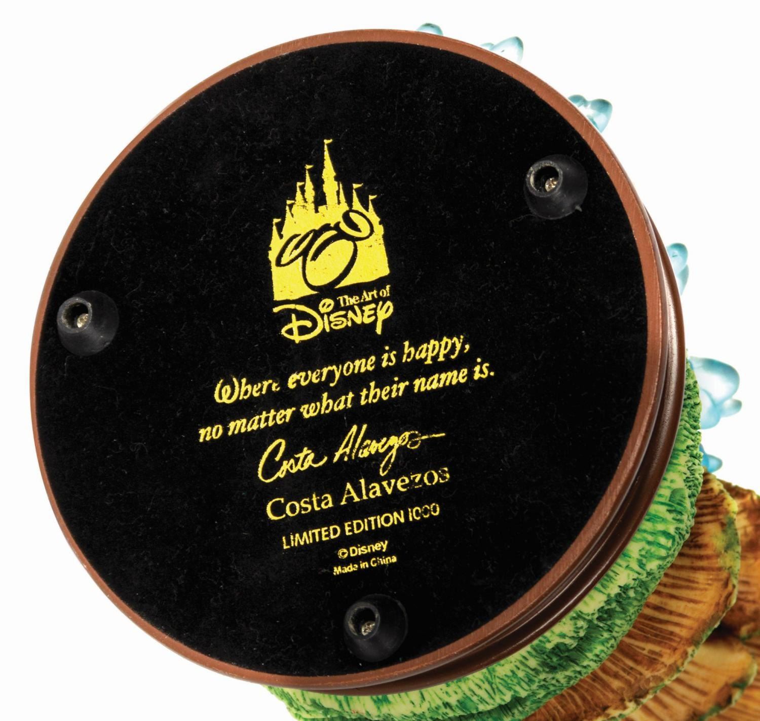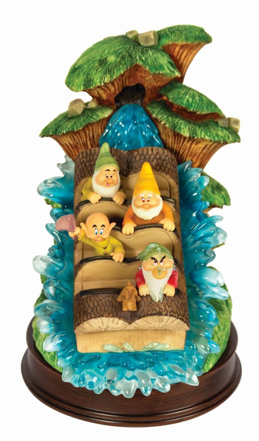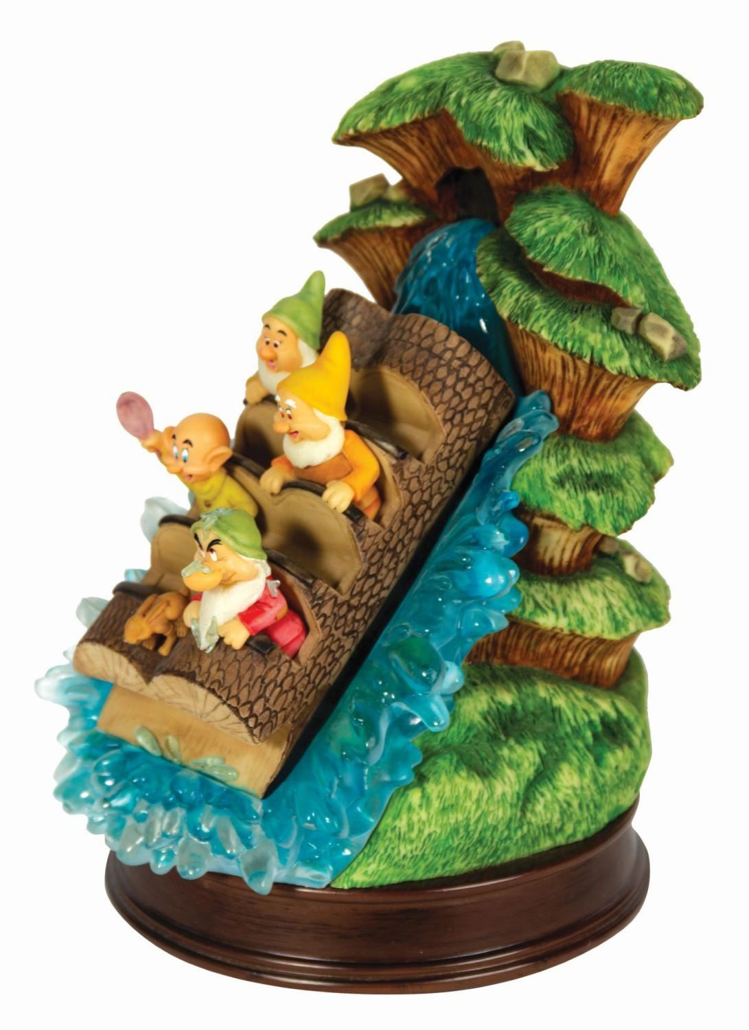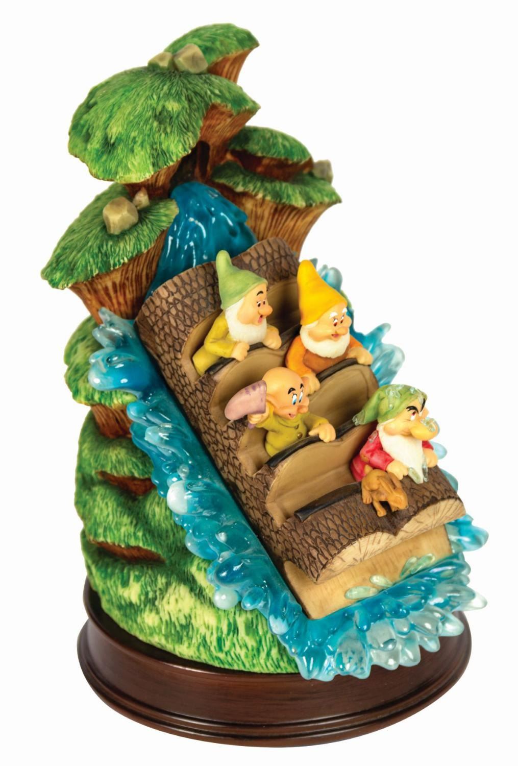 (Disneyland, 2005) A limited edition figurine depicting Grumpy, Dopey, Happy, and Sleepy riding Splash Mountain titled "Where everyone is happy, no matter what their name is" by artist Costa Alavezos. The intricately detailed figurine is composed of hand-painted cast resin affixed to a footed wooden pedestal base. Created in an edition of 1000, the felted bottom of the base is stamped with The Art of Disney series information. Measuring 8.25"x5.25"x6.25", the figurine is in very good condition with minor spot surface wear at the top of the waterfall.