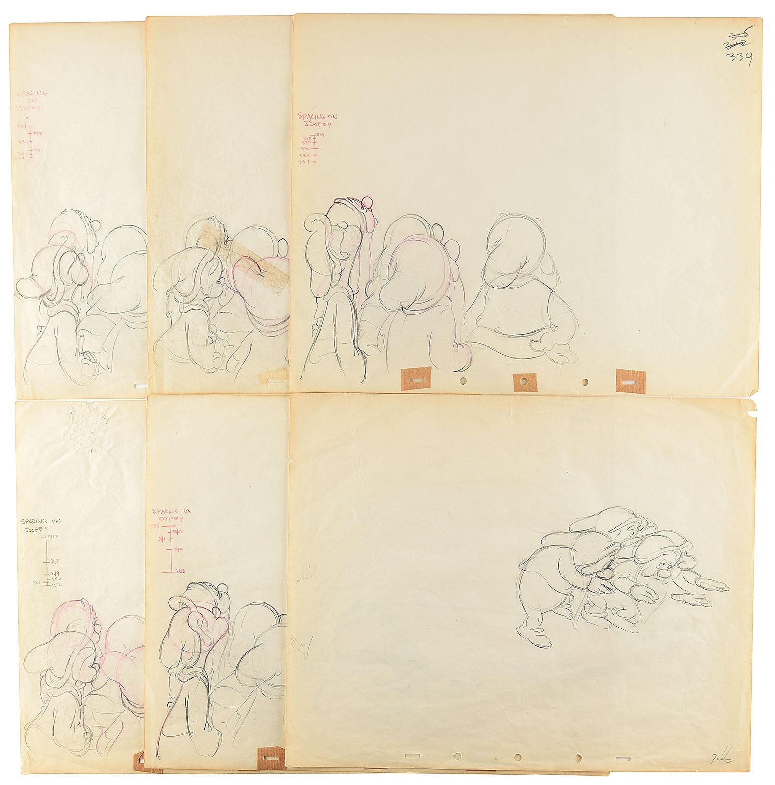 (Walt Disney Studios, 1937) Six original rough production drawings featuring the dwarfs from Snow White and the Seven Dwarfs, including six similar views of the backs of their heads, and one front-facing angle. Accomplished in graphite and colored pencil on untrimmed 15.5 x 12.5 animation paper. Four of the drawings include timing marks and mention the "spacing on Dopey." Total images measure approximately 9 x 5.5 and 7 x 5 In overall very good to fine condition, with some scattered creasing and a tape-repaired tear to one sheet. From the estate of Cecil Beard, an animator at Disney Studios from 1936-1940.