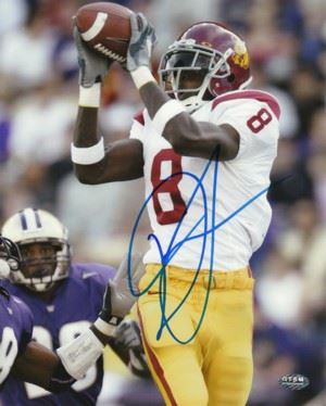 A two-time All-American, Dwayne Jarrett was USC's all-time receptions leader with 216 and the Pacific 10 Conference's all-time leader in touchdown receptions with 41. On January 1, 2007, he was named offensive MVP of the Rose Bowl Game with a career high 203 receiving yards and two touchdowns in the 32-18 win over Michigan. Dwayne Jarrett has hand autographed this USC Trojans 8x10 Color Photo. Jarrett Hologram and Certificate of Authenticity from Athlon Sports.