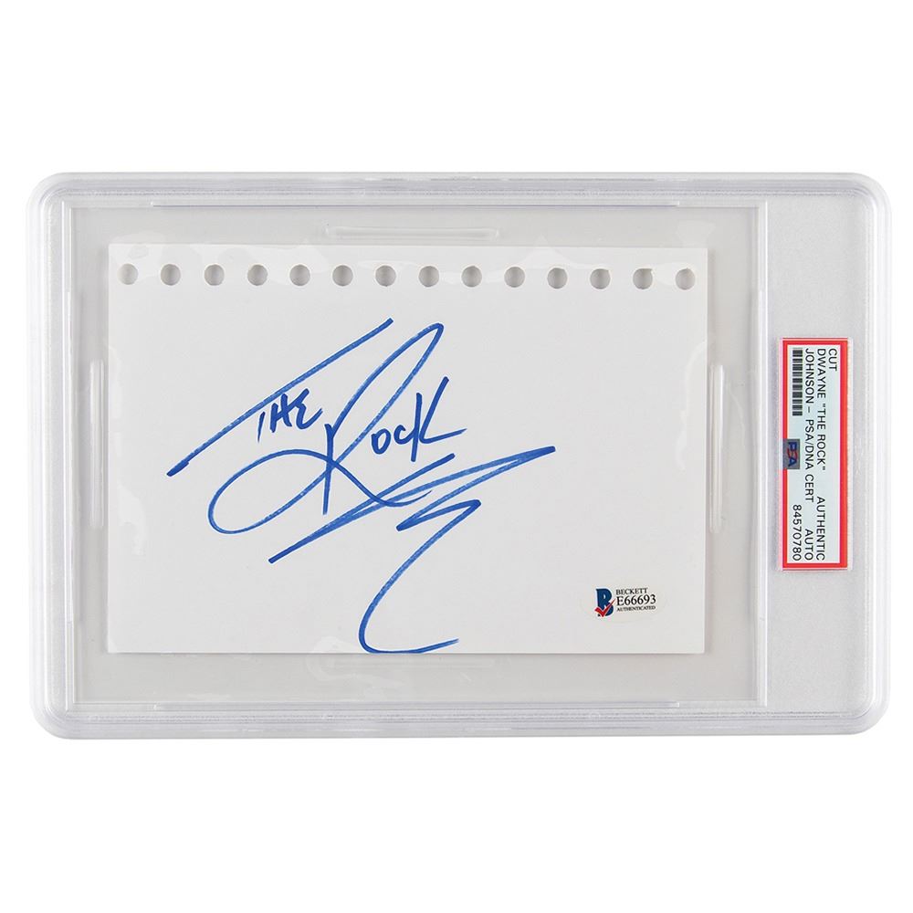 Blue felt tip signature of Dwayne Johnson, "The Rock,†on an off-white 7 x 4.75 sheet of notebook paper. In very fine condition. Encapsulated in a PSA/DNA authentication holder. Accompanied by a certificate of authenticity from Beckett Authentication Services.