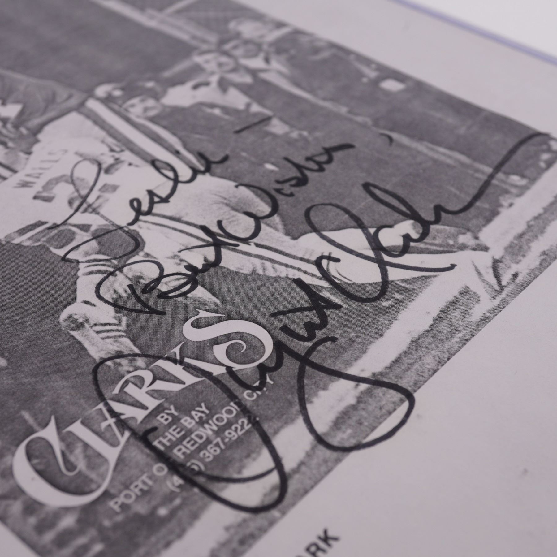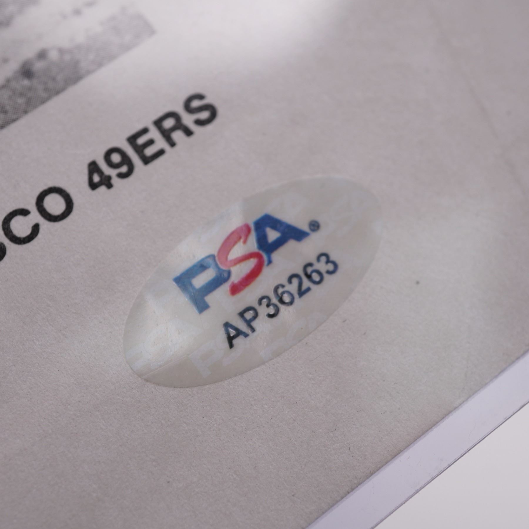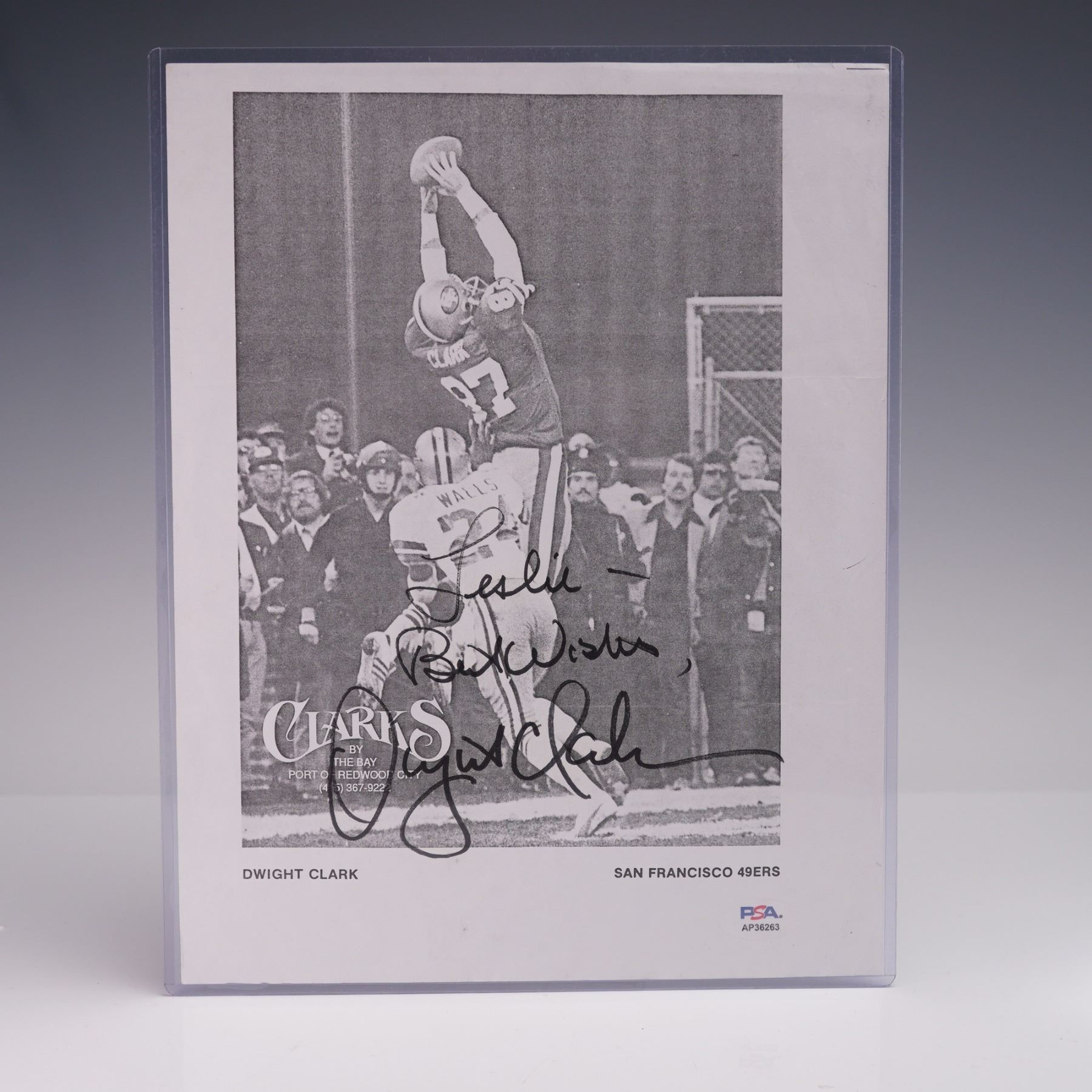 Black and white photo hand signed by San Francisco 49ers wide receiver Dwight Clark, featuring the legendary moment from the 1982 NFC Championship known as The Catch. This iconic image captures Clark's game-winning touchdown reception from Joe Montana over Cowboys defender Everson Walls, a defining play that launched the 49ers dynasty under coach Bill Walsh. The autograph includes a personalized inscription reading Leslie Best Wishes. Authenticated by PSA with matching tamper evident sticker and COA. Measures approx. 8.5"L x 11"H.