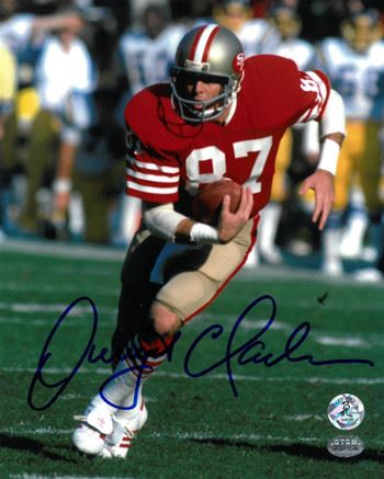 Dwight Clark's most memorable touchdown came in the 1982 NFC Playoffs. On January 10, 1982, against the Dallas Cowboys, the San Francisco 49ers were trailing 27–21 in the final minute of play to advance to the Super Bowl. Clark leaped and caught a six-yard pass from quarterback Joe Montana in the back of the end zone to give the 49ers a 28–27 victory. That play, one of the most famous in the history in the NFL, has been immortalized as "The Catch" practiced as the "Hail Mary." Clark finished the game with eight receptions for 120 yards and 2 touchdowns. Dwight Clark has hand autographed this San Francisco 49ers 8x10 Photo. Clark Hologram and Certificate of Authenticity from Athlon Sports Collectibles.