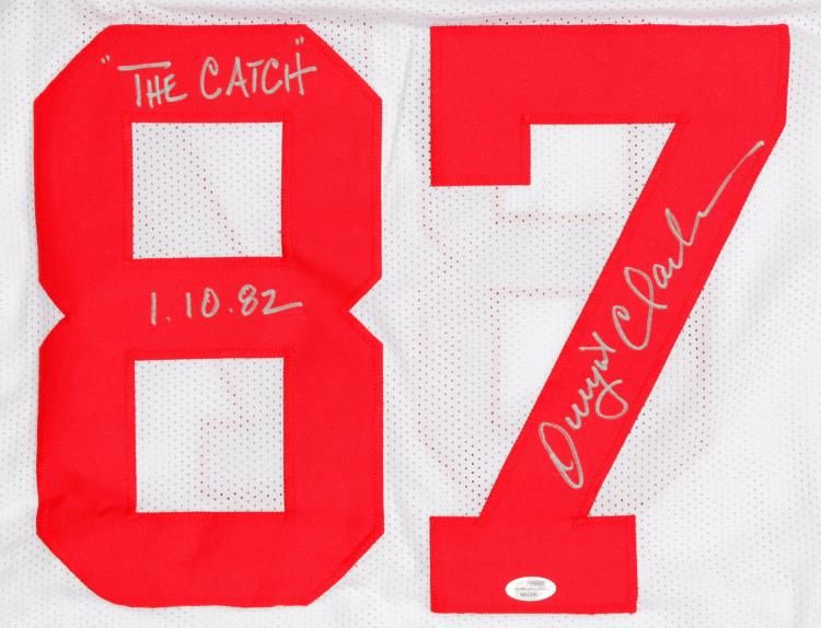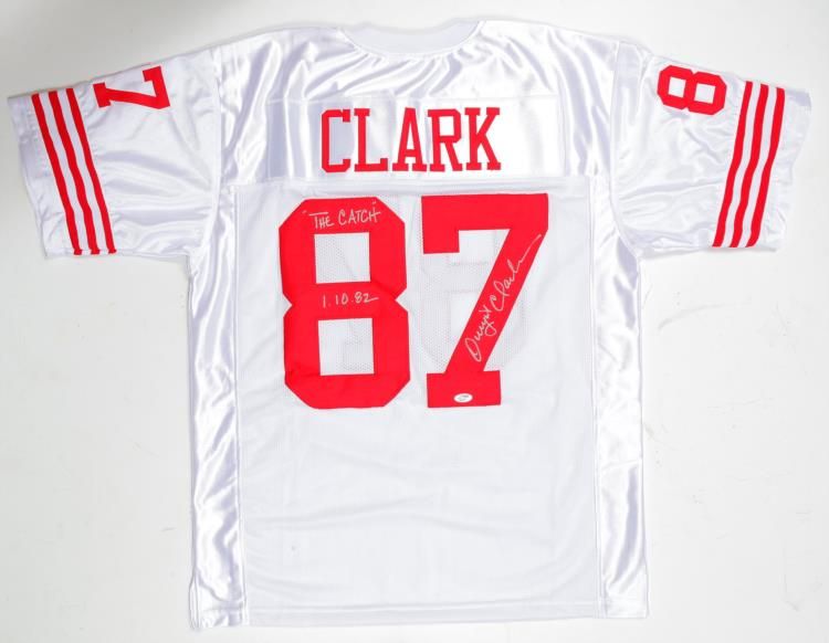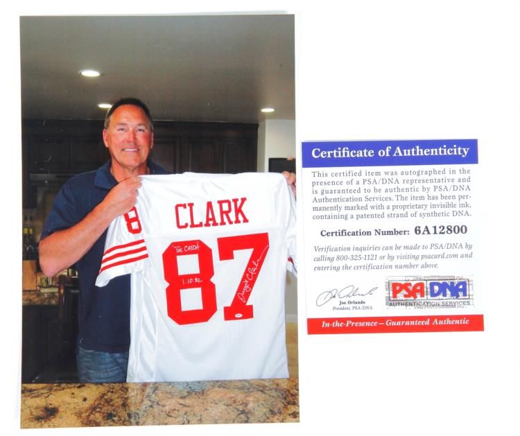 Dwight Clark Signed White Red Football Jersey COAIncludes PSA DNA Certificate of Authenticity and a photo of Dwight Clark holding the signed Jersey.