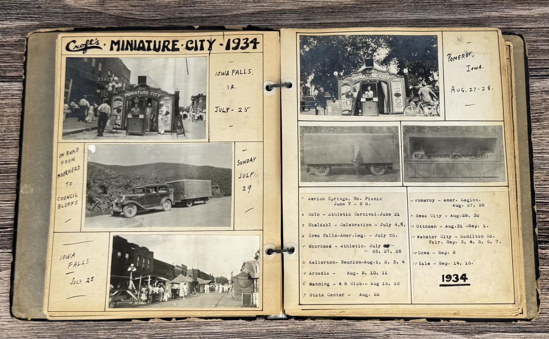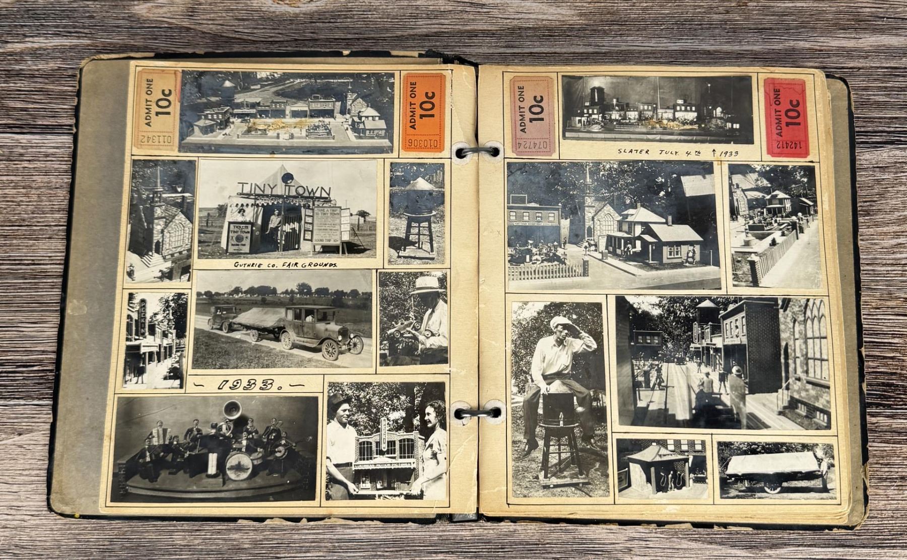 Wonderful and historic photo album. It shows the career of Dwight Croft of Sheldahl Iowa from 1933-1938. The traveling roadside attraction display changed names several times. Tiny Town, Croft's Miniature City, Croft's Marionettes, Croft's Marionette Orchestra, Croft's Marionette Revue, Croft's Miniature Electric Carnival. His career seems to be lost to time other than this album. 70 total images.