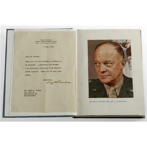<B>Dwight D. Eienhower 1944 Typed Letter Signed</B></I> TLS: <I>"Dwight D. Eisenhower"</B></I> as Supreme Commander, Allied Expeditionary Force, 1p, 6" x 8". Supreme Headquarters, July 7, 1944. To Frank J. Beebee, Newtonville, Mass. In full: <I>"Thank you for your kindness in sending me my monogram. I appreciate the thought. I am enclosing a facsimile of my shoulder sleeve insignia. Thank you for your good wishes."</B></I> General Eisenhower had led the invasion of Normandy on D-Day, June 6, 1944, just one month earlier. The letter is affixed to a page of a specially bound, hardcover scrapbook, with "IKE 1953" in gilt lettering imprinted on the spine. The book measures 6.5" x 8.5" and has 68 pages with photographs affixed to one side only. Many are Associated Press black & white photographs, but there are also photographs clipped from magazines and newspapers, all relating to Dwight D. Eisenhower, with most picturing him. A four page typed article from the June 1, 1952 edition of "The New York Times" (about Ike's candidacy for the 1952 presidential nomination) is near the front of the book and a one page typed index is in the back. The 8" x 10.5" color "facsimile of my shoulder sleeve insignia" mentioned by General Eisenhower has been tipped to a page. Letter and insignia facsimile sheet each bear one horizontal and one vertical fold from mailing. Overall, the book is in fine condition. A unique addition to an Eisenhower collection. From the Henry E. Luhrs Collection. Accompanied by LOA from PSA/DNA.