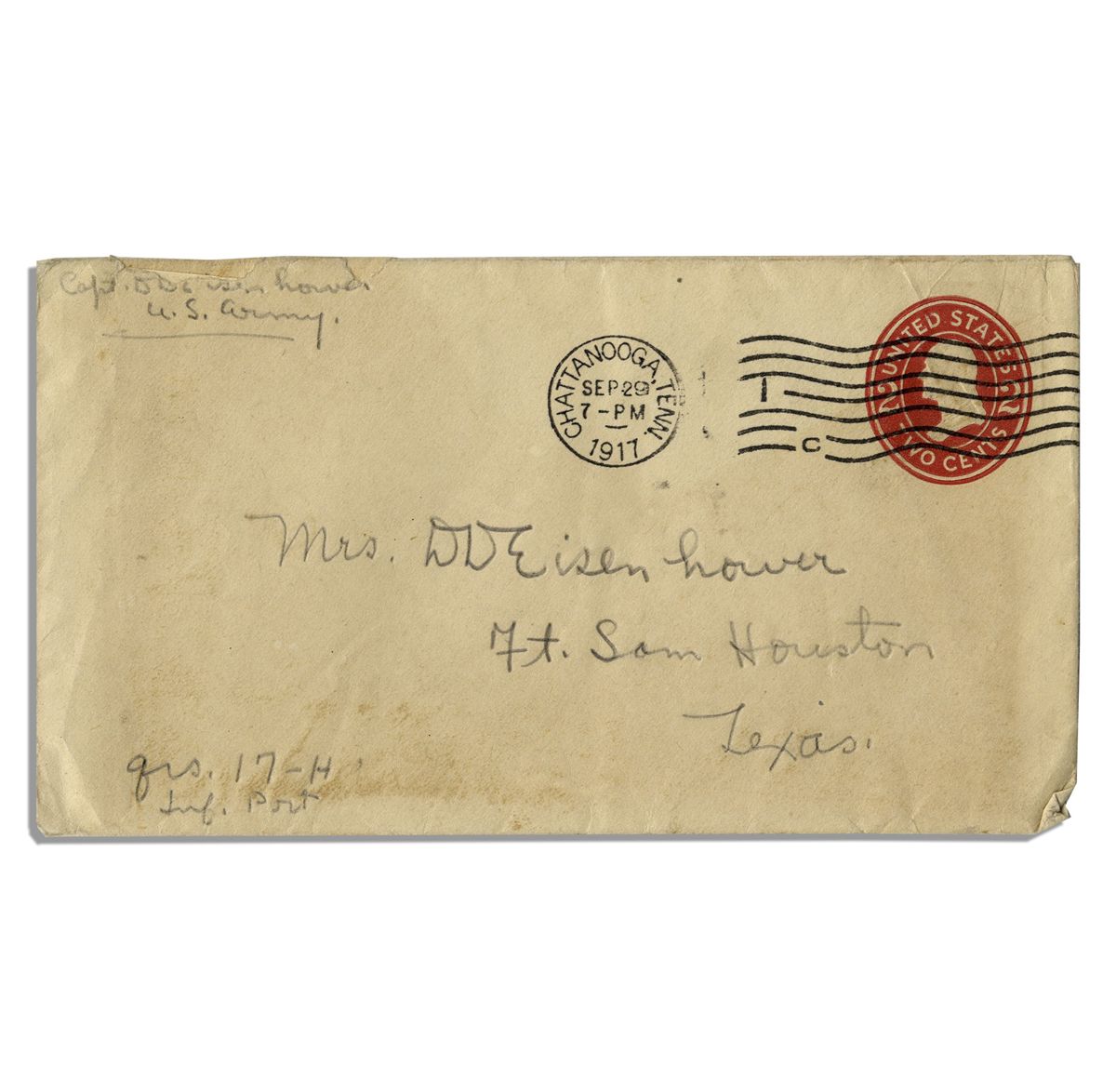 Dwight D. Eisenhower Free Frank signed envelope, postmarked 29 September 1917 from Chattanooga, Tennessee. Signed in pencil, ''Capt. DD Eisenhower / U.S. Army'' and addressed in his hand, ''Mrs. DD Eisenhower / Ft. Sam Houston / Texas''. Measures 6.25'' x 3.5'' with some toning and letter removed. Very good.