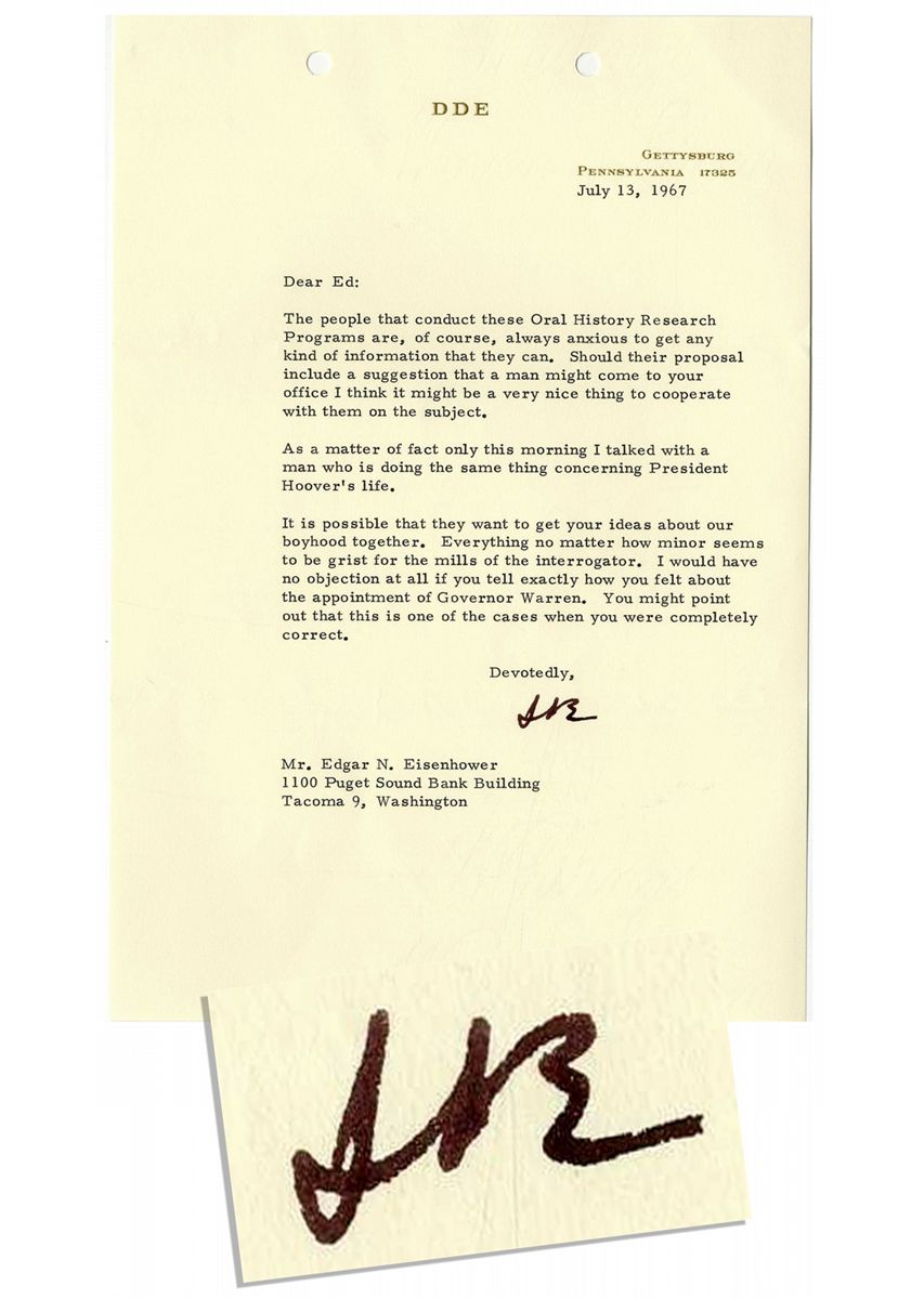 Dwight D. Eisenhower typed letter signed ''Ike'', dated 13 July 1967, on personal ''DDE'' letterhead. Written to the President's older brother, Edgar, letter reads in part: ''...I would have no objection at all if you tell exactly how you felt about the appointment of Governor Warren. You might point out that this is one of the cases when you were completely correct...'' Eisenhower once famously remarked that his appointment of Warren was ''the biggest damned-fool mistake I ever made.'' 7'' x 10.25'' letter has folds from mailing; near fine.