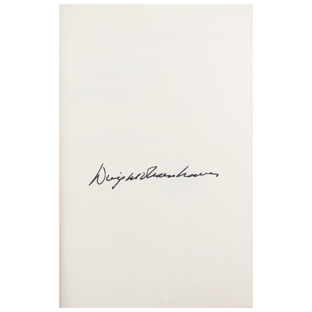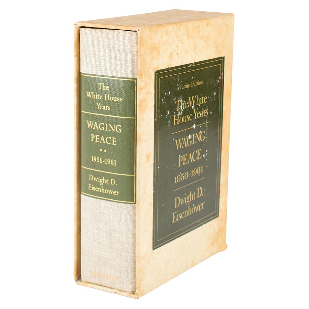 Waging Peace: 1956-1961. First edition, limited issue, numbered 65/1500. NY: Doubleday, 1965. Hardcover, 6.5 x 9.75, 741 pages. Boldly signed opposite the colophon in fountain pen, "Dwight D. Eisenhower." Long was a lieutenant colonel who investigated and reported on General George S. Patton's famed slapping of a soldier. Autographic condition: fine. Book condition: VG/None in G+ slipcases, with heavy staining to cases, and a partially separated bottom panel of Waging Peace. Accompanied by two letters addressed to Long and two newspaper clippings.