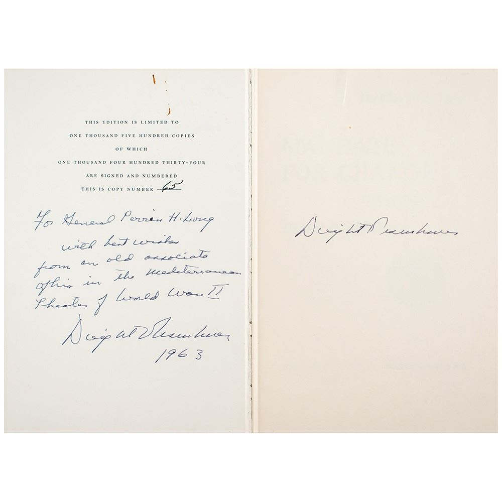 Mandate for Change: 1953-1956. First edition, limited issue, numbered 65/1500. NY: Doubleday, 1963. Hardcover, 6.5 x 9.75, 650 pages. Signed and inscribed on the colophon in fountain pen, "For General Perrin H. Long, with best wishes from an old associate of his in the Mediterranean Theater of World War II, Dwight Eisenhower 1963," and on the facing page, "Dwight D. Eisenhower."