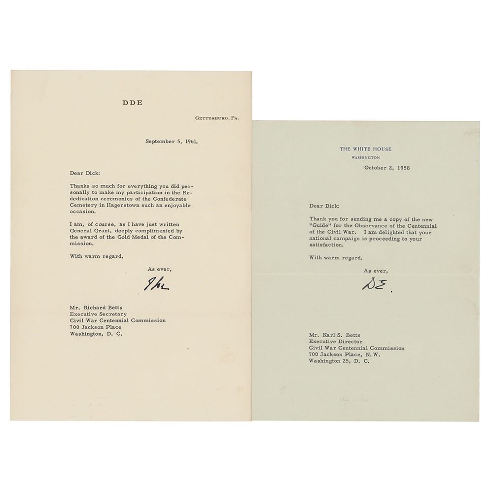 Two letters, both to executives of the Civil War Centennial Commission: a TLS as president, signed "D. E.," one page, 6.75 x 8.75, White House letterhead, October 2, 1958, in part: "Thank you for sending me a copy of the new 'Guide' for the Observance of the Centennial of the Civil War. I am delighted that your national campaign is proceeding to your satisfaction"; and a TLS signed "Ike," one page, 7 x 10.5, personal letterhead, September 5, 1961, in part: "Thanks so much for everything you did personally to make my participation in the Rededication ceremonies of the Confederate Cemetery in Hagerstown such an enjoyable occasion. I am of course, as I have just written General Grant, deeply complimented by the award of the Gold Medal of the Commission." In overall fine condition.