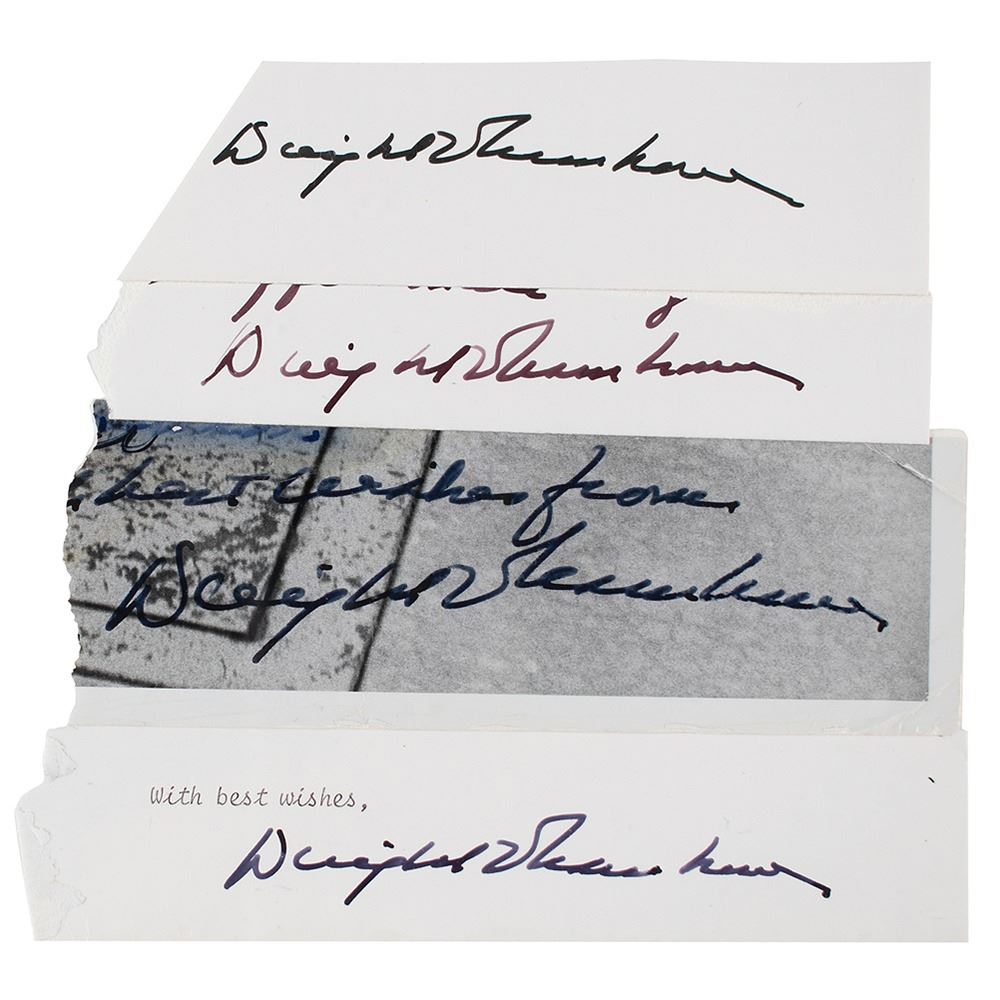 Four fountain pen signatures, "Dwight D. Eisenhower," on individual slips removed from photographs. In overall very good to fine condition, with rough edges and some scattered creasing.