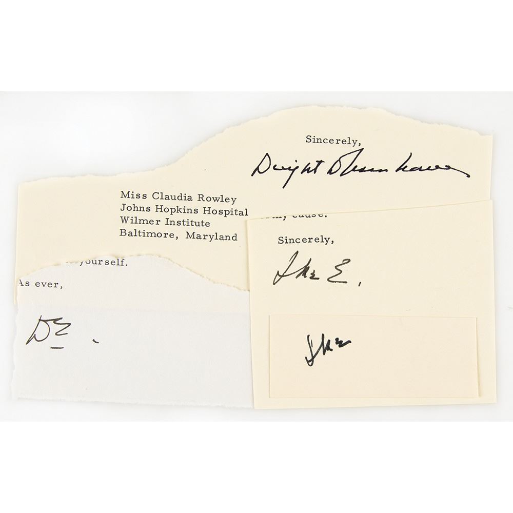 Four ink signatures of Dwight D. Eisenhower on individual off-white slips removed from the close of letters, with Eisenhower signing his name in different variations—"Dwight D. Eisenhower," "Ike," "Ike E.," and "D. E." In overall fine condition.