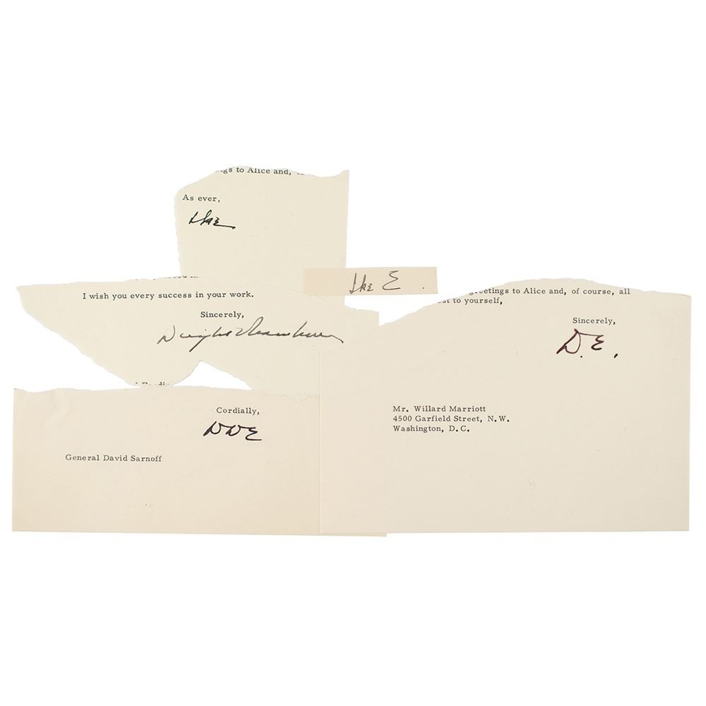 Five ink signatures of Dwight D. Eisenhower on individual off-white slips removed from the close of letters, with Eisenhower signing his name in different variations—"D. E.," "D. D. E.," "Ike," "Ike E.," and "Dwight D. Eisenhower." In overall fine condition.