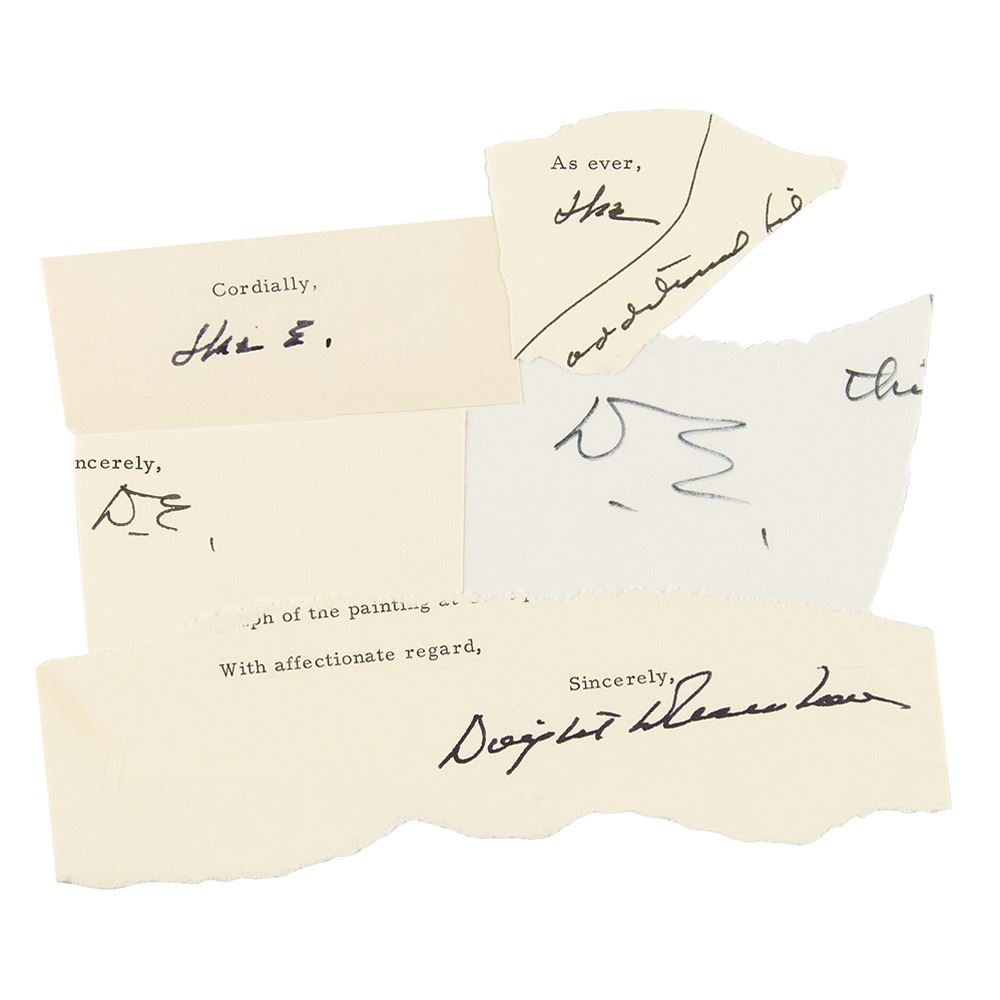 Five ink signatures of Dwight D. Eisenhower on individual off-white slips removed from the close of letters, with Eisenhower signing his name in different variations—"Dwight D. Eisenhower," "Ike," "Ike E.," and two "D. E." In overall fine condition.
