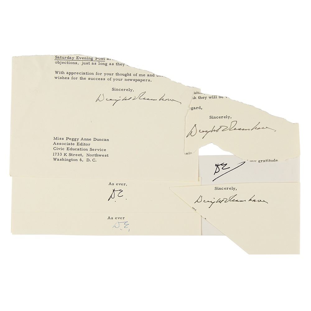 Six ink signatures of Dwight D. Eisenhower on individual off-white slips removed from the close of letters, with Eisenhower signing his name in two different variations: includes three "Dwight D. Eisenhower" and three "D. E." In overall fine condition.
