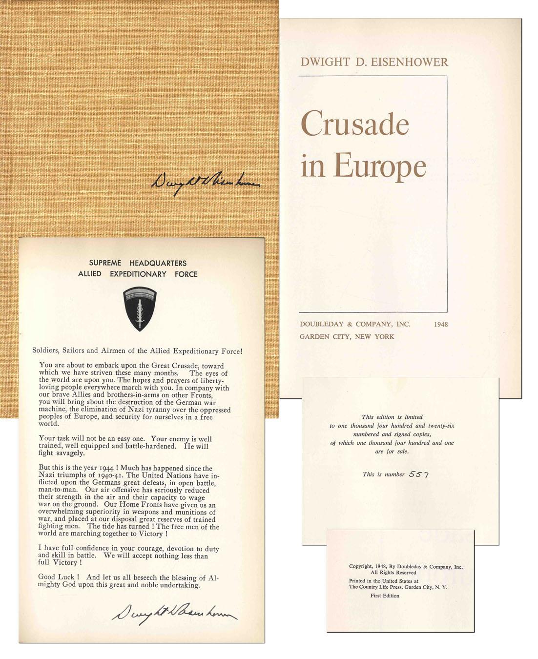 Dwight D. Eisenhower's ''Crusade in Europe'' first edition, with maps illustrated by artist Rafael Palacios. New York: Doubleday & Company: 1948. Signed limited edition of 1426 copies, numbered 557. Boldly signed ''Dwight D. Eisenhower'' in black ink beneath the rare facsimile printing of Eisenhower's D-Day order to send troops to storm the beaches of Normandy. The text is Eisenhower's personal account of World War II with a table of contents that starts with ''Platform For Invasion'' and stretches past, ''Hitler's Last Bid.'' Volume measures 6.5'' x 10'' and runs 559pp. With gilded tan cloth boards, top edges gilt and deckled edges. Illustrated throughout with numerous black and white photographs, maps and diagrams. Limited edition page has a 1.5'' tear along the left side and front free endpaper has a 1'' tear in the center of the page, presumably from the removal of a label on verso. Signed D-Day speech is in fine condition. Near fine overall.