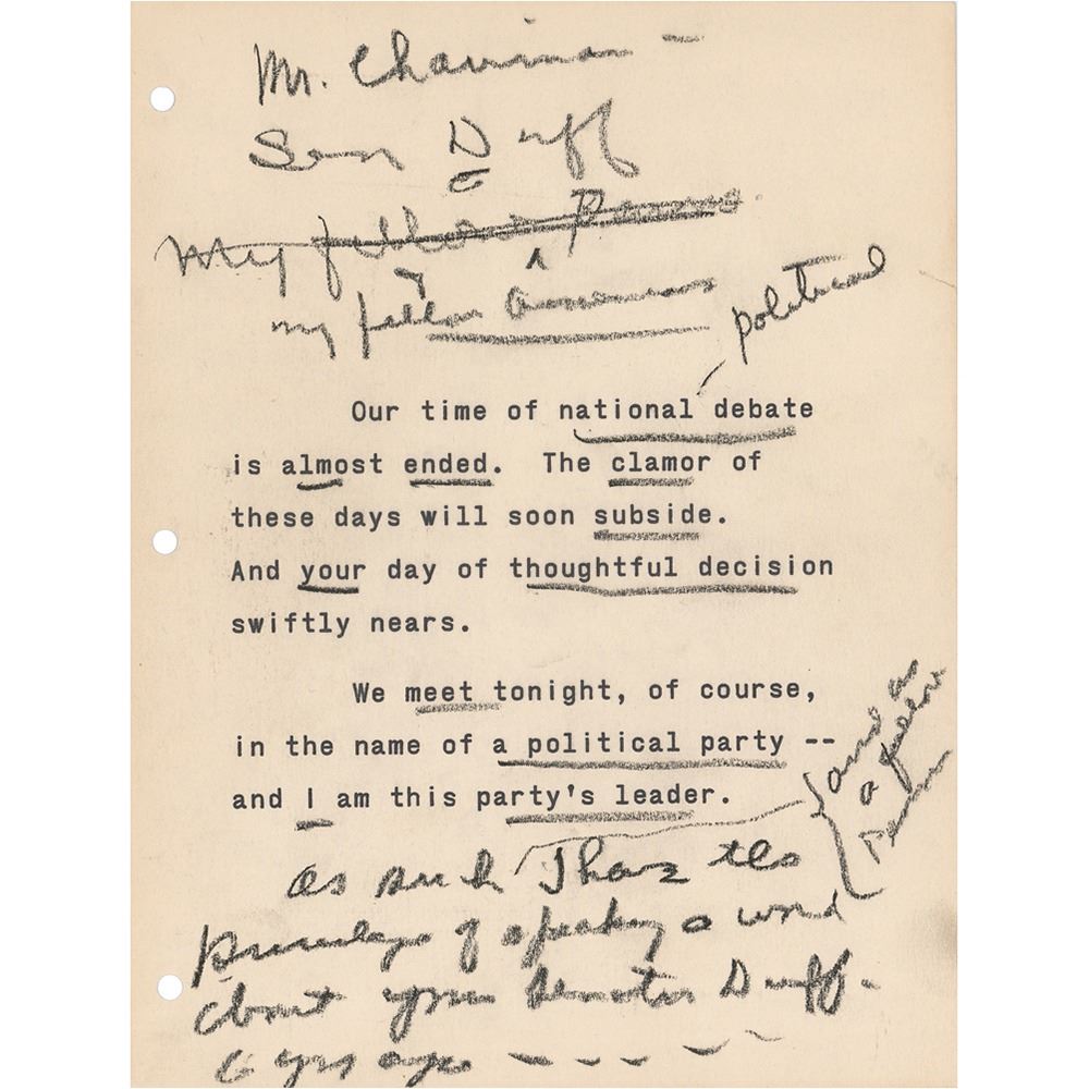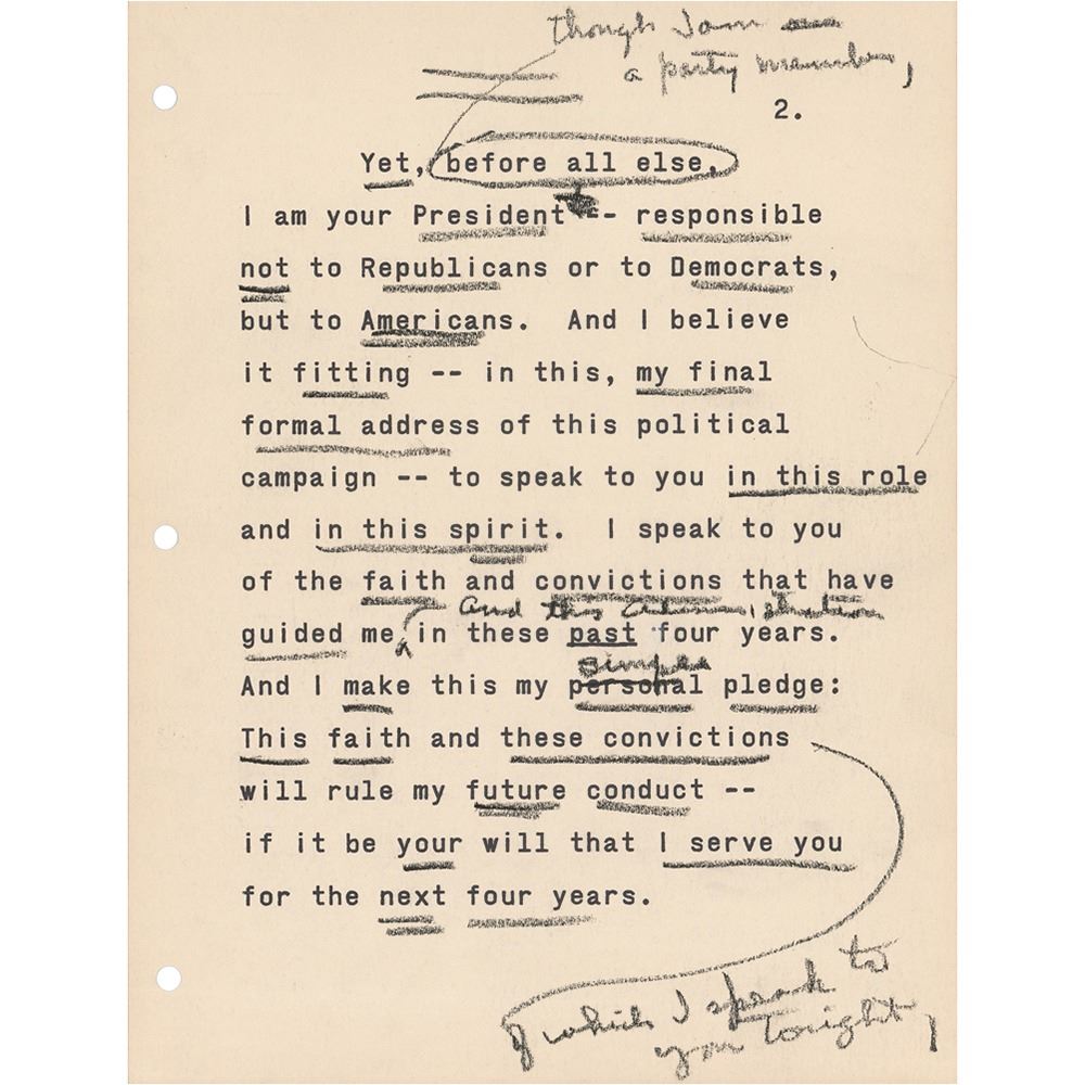 Hand-corrected partial draft of Dwight D. Eisenhower's last speech from his 1956 re-election campaign, two pages, 8 x 10.5, boasting nearly 50 words in Eisenhower's hand with numerous underlines, cross-outs, and circled words. Eisenhower would deliver this address to his supporters at the Philadelphia Convention Hall on November 1, 1956. At the top, he writes: "Mr. Chairman - Sen. Duff & [My Fellow Penns., struck through], My fellow Americans." He adds the word "political" to the first line, and scrawls a complimentary note about former US Senator James H. Duff, who escorted him to the platform at the Convention Hall. On the second page, Ike inserts "though I am a party member" when speaking to his responsibility to Americans of all parties, adds "and this Administration" to the middle of the page, replaces the word "personal" with "simple," and writes "of which I speak to you tonight" at the bottom. In fine condition.