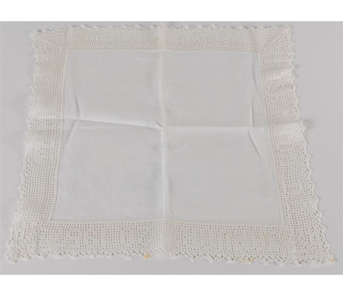 Two items: a beautiful linen handkerchief with hand-crocheted lace edges, measuring 11.5 x 11.5, made to commemorate President Eisenhower’s second inauguration, with “Eisenhower,” “January 20, 1957,” “Washington DC,” and “Mamie,” beautifully crocheted within the lace-trimmed borders in block letters; and a presidential campaign button, measuring 3.5? in diameter, with a patriotic color scheme and the famous slogan, “I Like Ike,” prominently displayed in the center. A nice pairing of this attractive textile art and well-designed campaign badge.