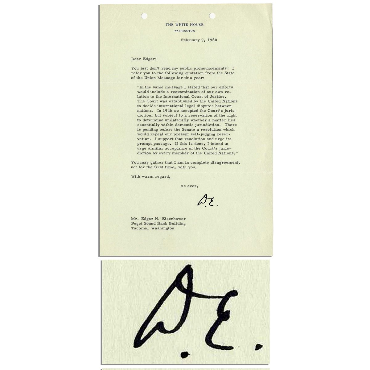 Dwight D. Eisenhower typed letter signed as President, dated 9 February 1960 on official White House stationery. Here, Eisenhower writes to his brother, Edgar, referring to a statement he made in his State of the Union address regarding the International Court of Justice: ''...You just don't read my public pronouncements! I refer to you the following quotation from the State of the Union Message for this year...'' The President then signs off with, ''You may gather than I am in complete disagreement, not for the time time, with you. With warm regard, As ever, [signed] D.E.''. Letter measures 7'' x 10.5'' on one page with two holes punched at top. Near fine.