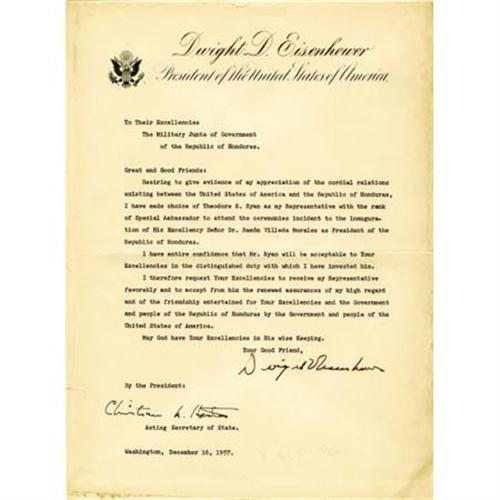 <B>Dwight D. Eisenhower Letter-of-State Signed "</B></I><B><I>Dwight D. Eisenhower</B></I></B></I><B>" as President.</B></I> One page, 10.25" x 14", Washington, December 16, 1957 "<I>To Their Excellencies The Military Junta of Government of the Republic of Honduras</B></I>" introducing his representative, Theodore S. Ryan who was attending the "<I>inauguration of His Excellency Senor Dr. Ramon Villeda Morales as President of the Republic of Honduras...</B></I>" Eisenhower expressed his "<I>entire confidence that Mr. Ryan will be acceptable to Your Excellencies in the distinguished duty with which I have invested him. I therefore request Your Excellencies to receive my Representative favorably and to accept form him the renews assurances of my high regard and of the friendship entertained for Your Excellencies and the Government and people of the Republic of Honduras by the Government and people of the United States of America...</B></I>" Countersigned by <B>Christian A. Herter</B></I> as Secretary of State. Some marginal wear with some minor chipping at bottom, light horizontal creases, else fine condition. <BR><BR><BR><b>Shipping:</b> Flat Material, Small (<a target="_blank" href="http://www.heritageauctions.com/common/shipping.php">view shipping information</a>)